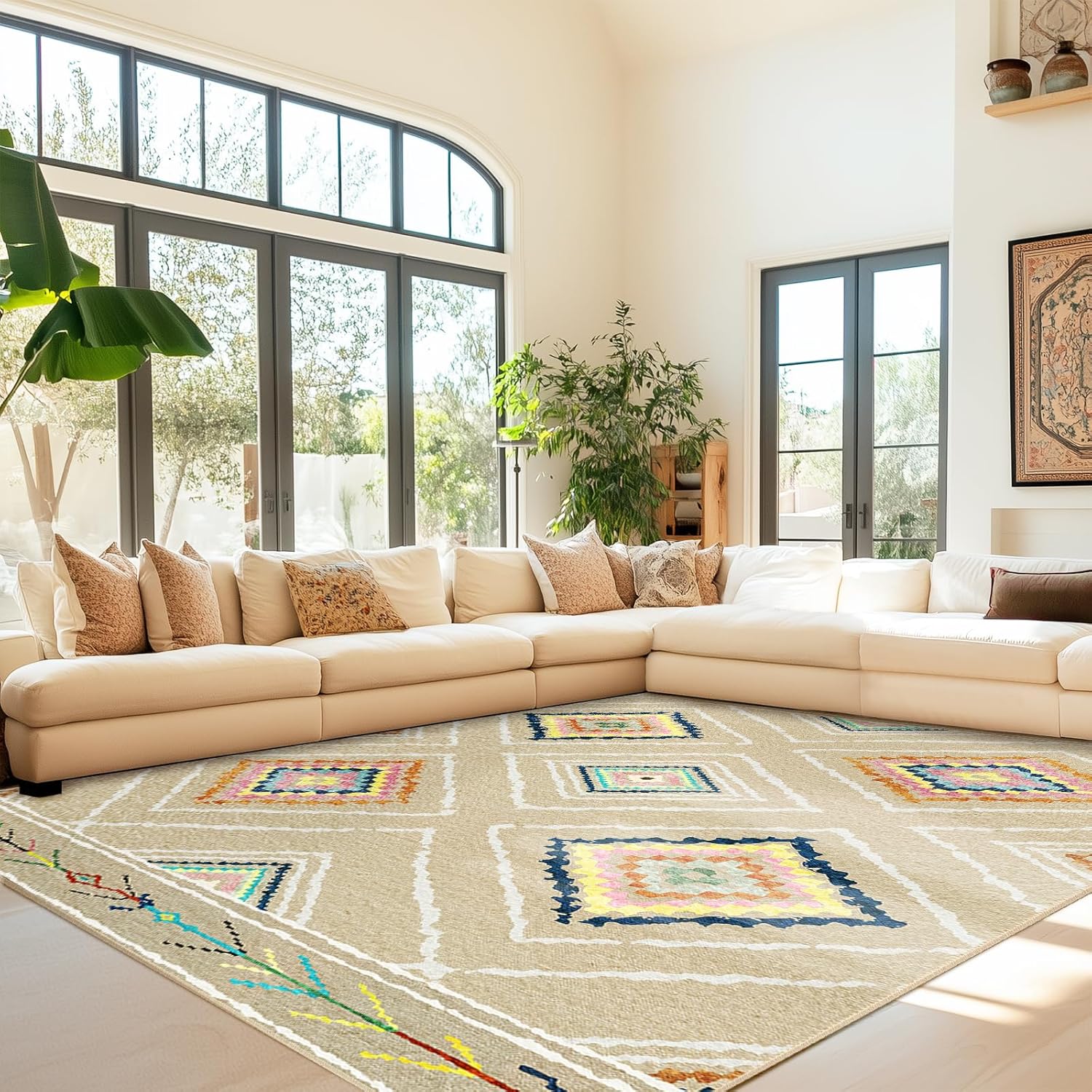 Ultra Soft: The 8×10 area rugs are made of reinforced faux wool, it is much more soft and comfortable. Machine made weave and high density stitched edge makes the rug can prevent from scratching and indoor high traffic.