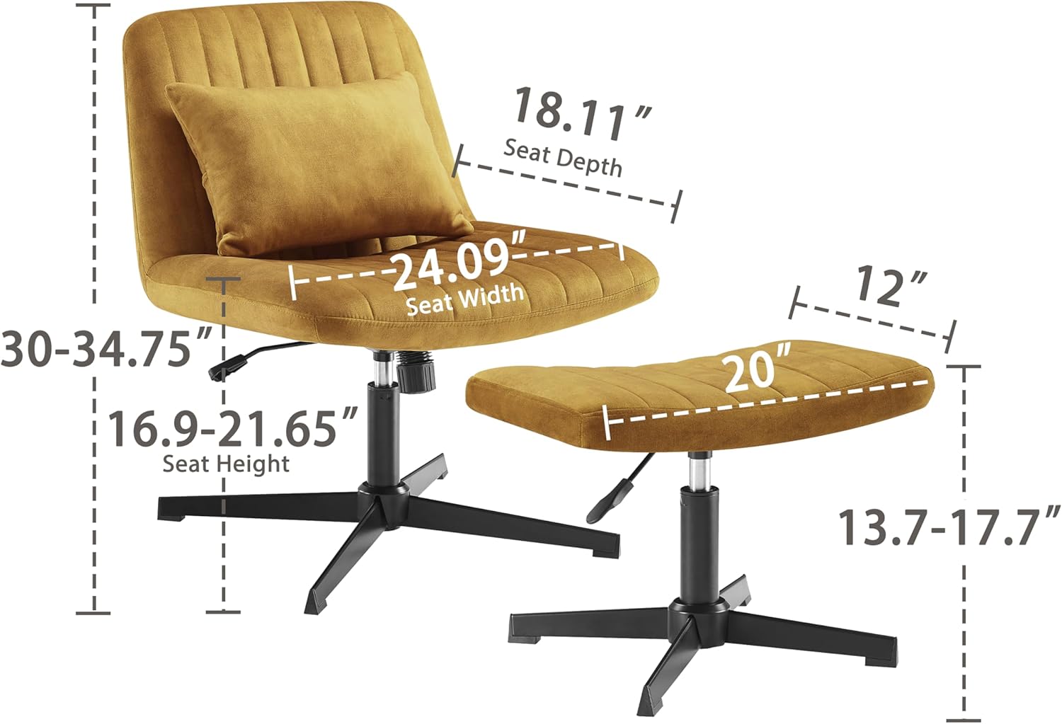 【Dimension】: Product Size: 23.62″W x 27.17″D x 30-34.75″H; Seat Size: 24.09″W x 18.11″D; Seat Height: 16.9-21.65″. All tool was provided and easy to assemble.