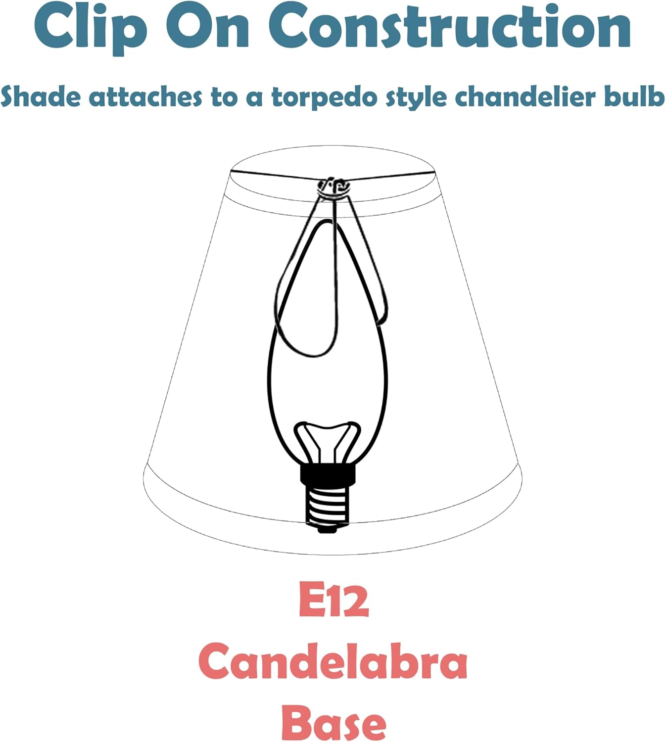- The shade is made with a clip-on styled fitter that is most compatible with torpedo chandelier light bulbs but can also be used with other bulbs that are similar in size. Clip-on style fitter designed for bare bulb chandeliers and wall sconces that use candelabra bulbs with an E12 base and 40 watt max, bent tip style bulbs not recommended (bulbs not included).