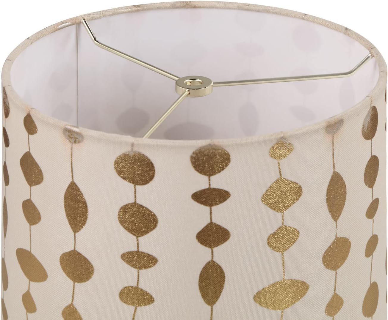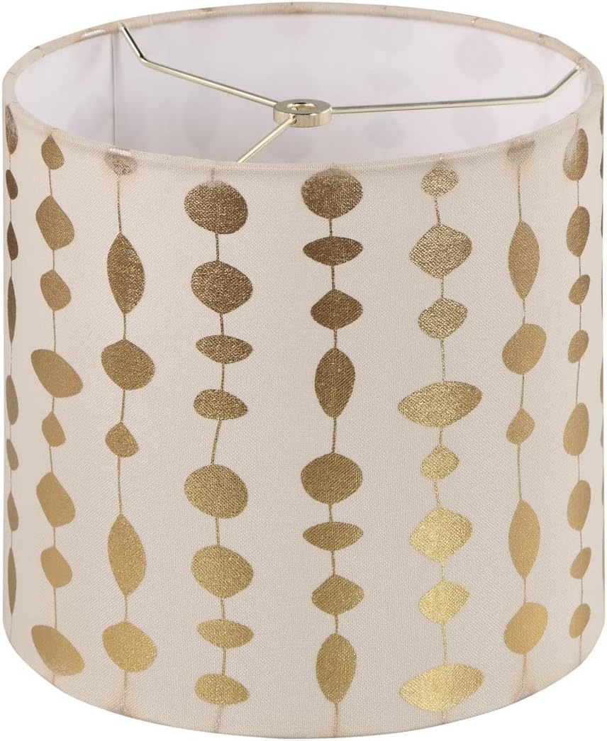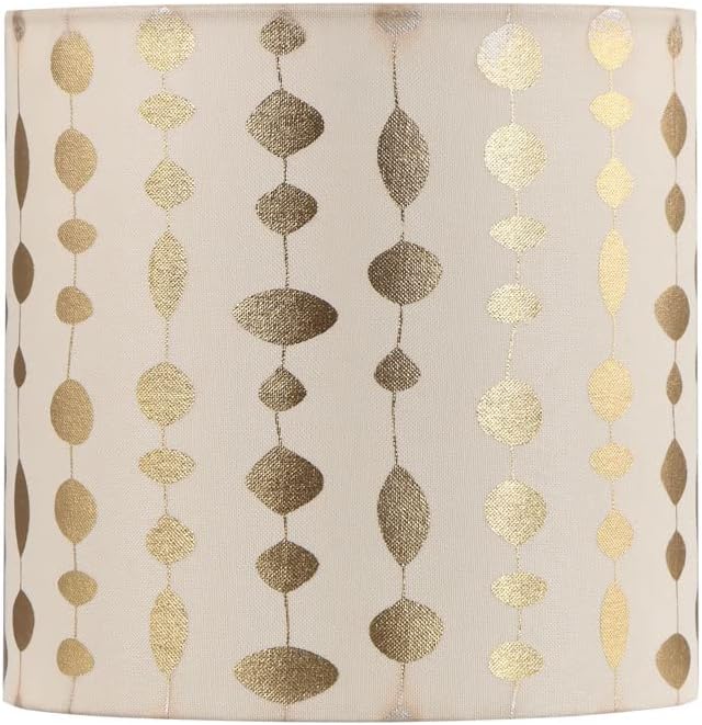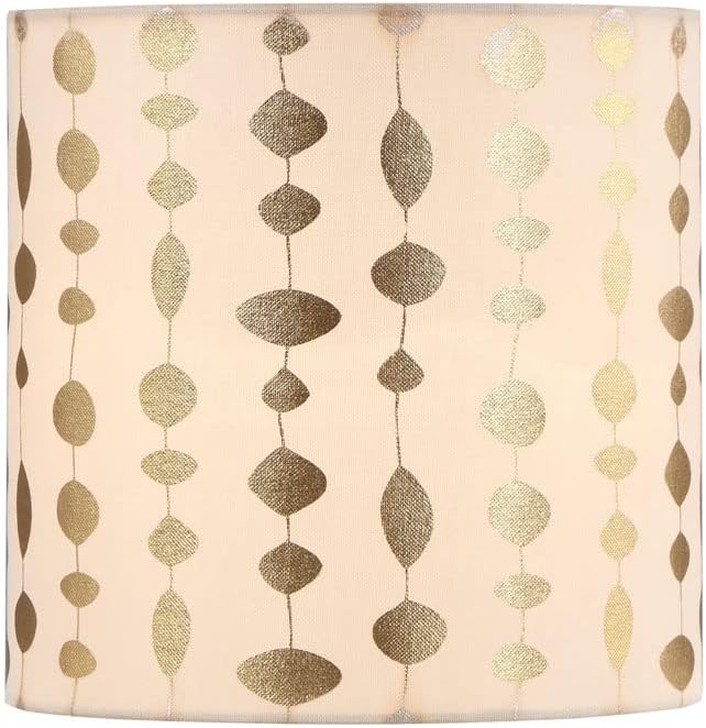 Aspen Creative offers a 1 pack transitional design drum (cylinder) replacement lamp shade in beige. Made with faux linen fabric and gold circle print. The lamp shade size is 10 inch top x 10 inch bottom x 10 inch height. This lamp shade is a spider construction – designed to attach to lamp harp. Applications – For table lamps, accent lamps, vintage lamps, candle stick lamps and kid’s room lamps. Our hardback shades use Virgin Styrene backing board to produce a warm, natural & smooth light – more appealing than shades made with recycled Styrene board that can crack & yellow over time.