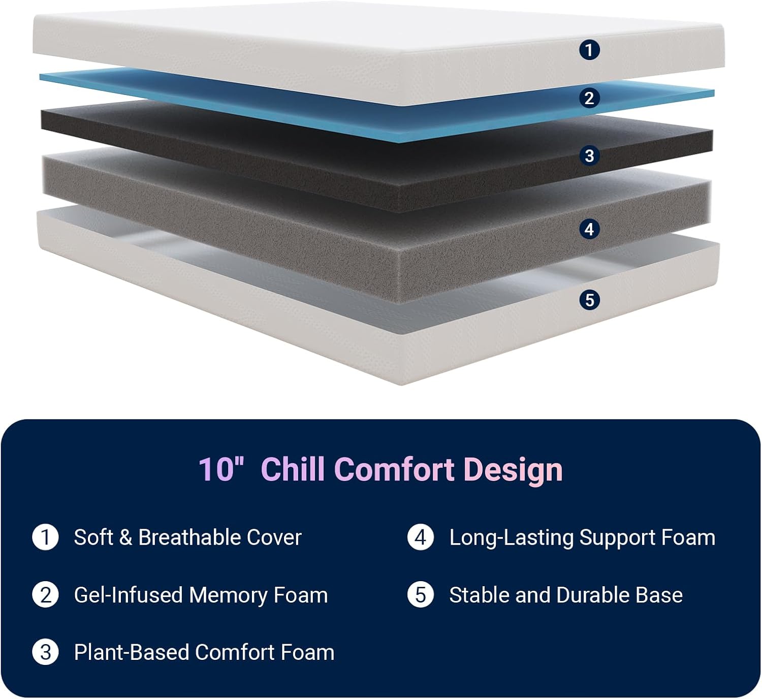 Motion Isolation Support: The queen size mattress features a 3-layer foam structure that absorbs noise and movement, preventing sleep disruptions. Enjoy balanced support and spinal alignment thanks to the high-density gel memory foam mattresses