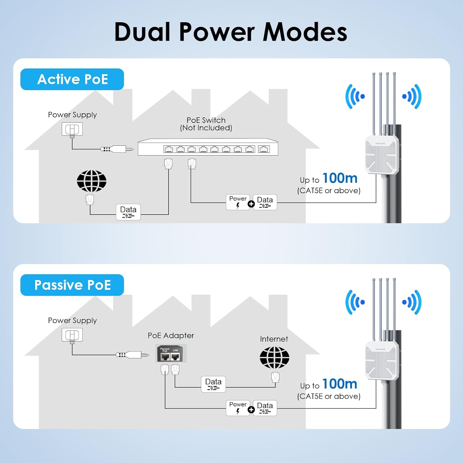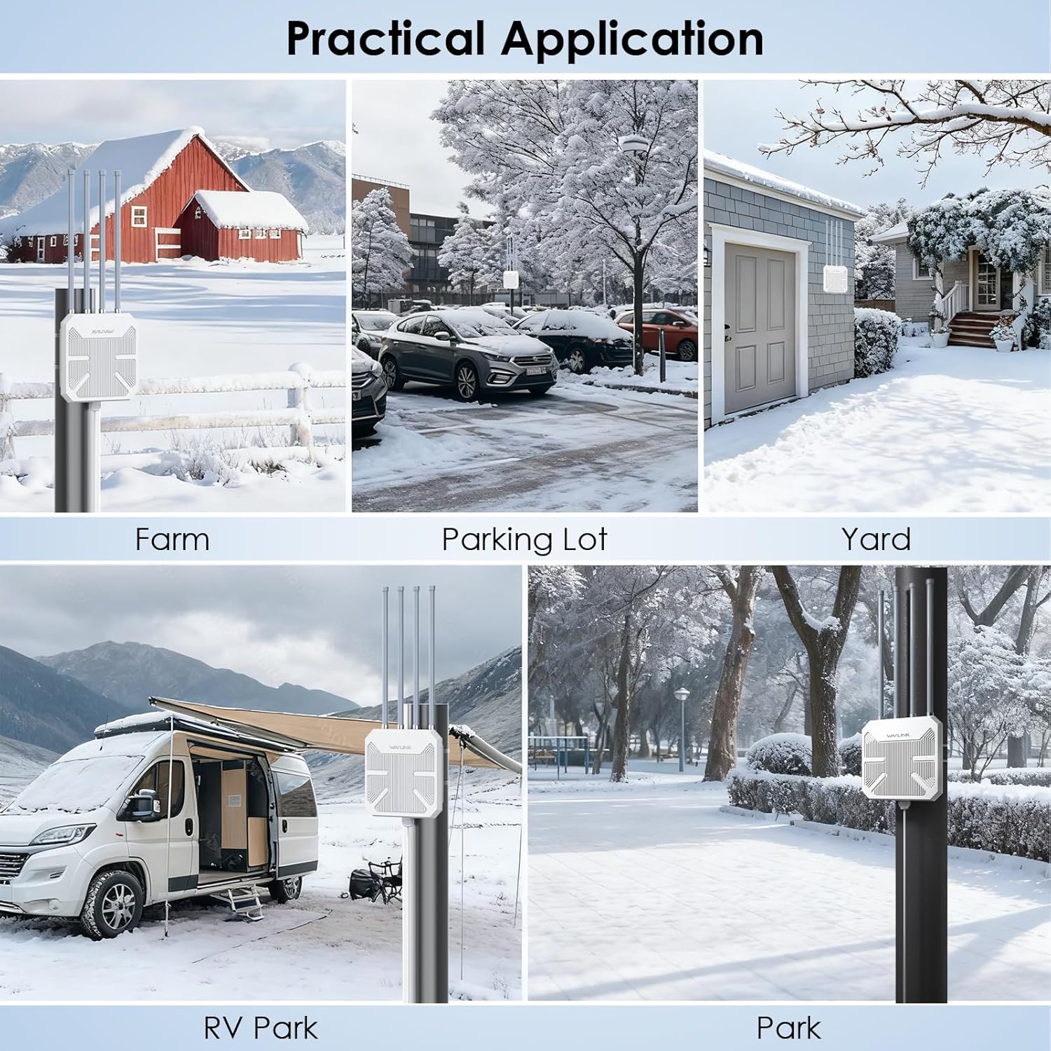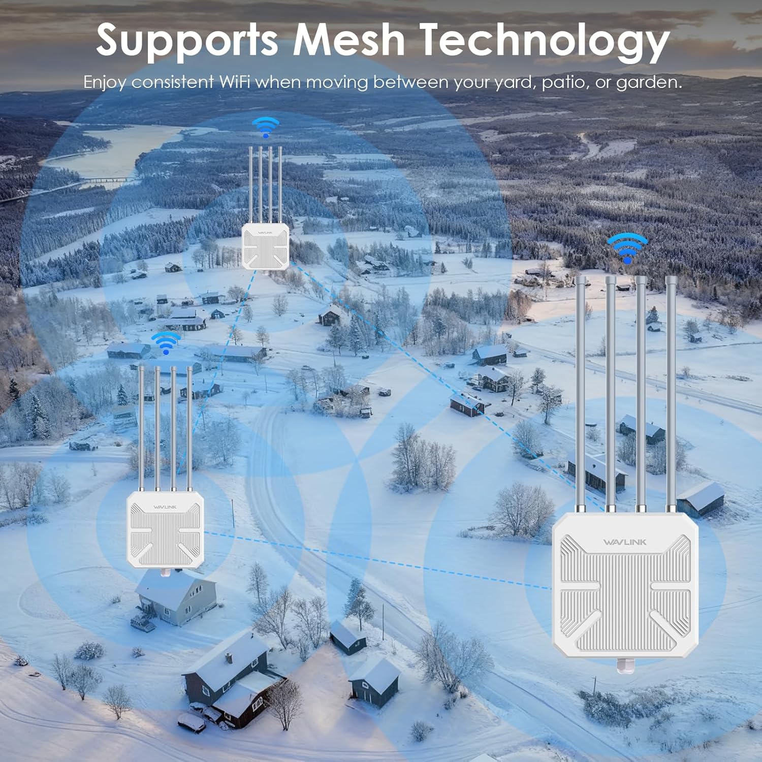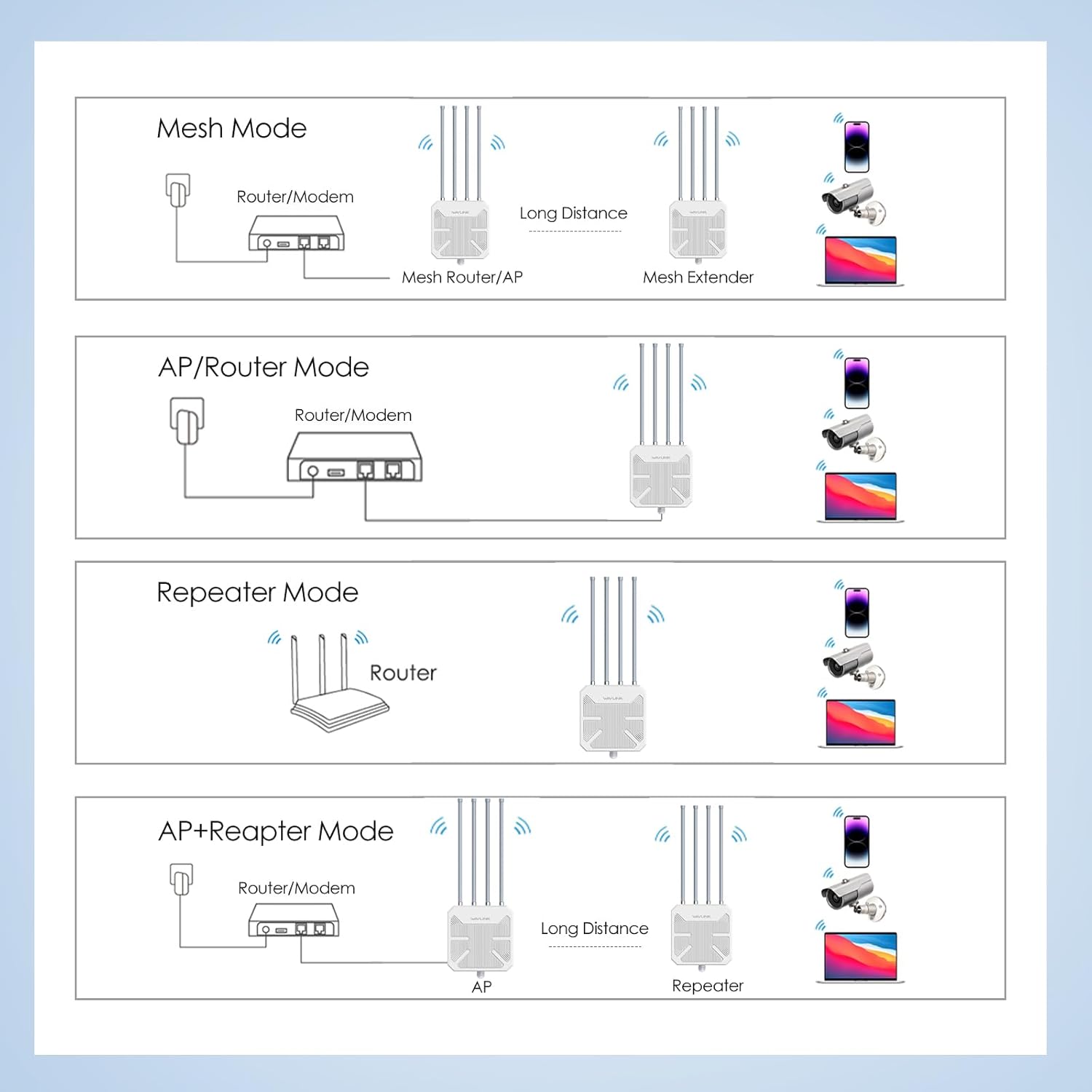 【Multiple Modes, Flexible Use】You can install it anywhere you want,Place as you like,Equipped with IP67 waterproof enclosure, 15kV ESD protection and 6kV lightning protection, it can work normally in rain/snow/wind/thunder and other bad weather. Supports Mesh, AP, Router, Repeater, AP+Repeater and other modes to meet your different needs and apply to more outdoor use scenarios