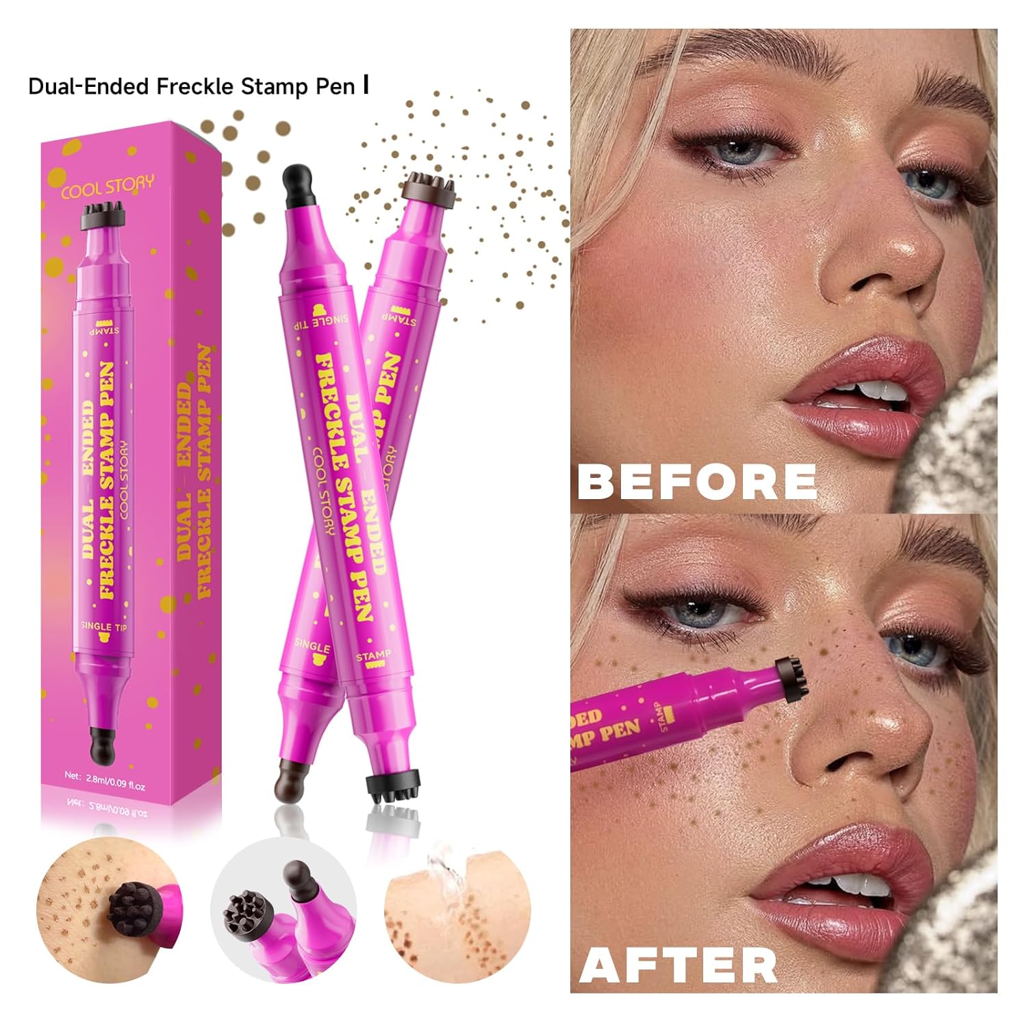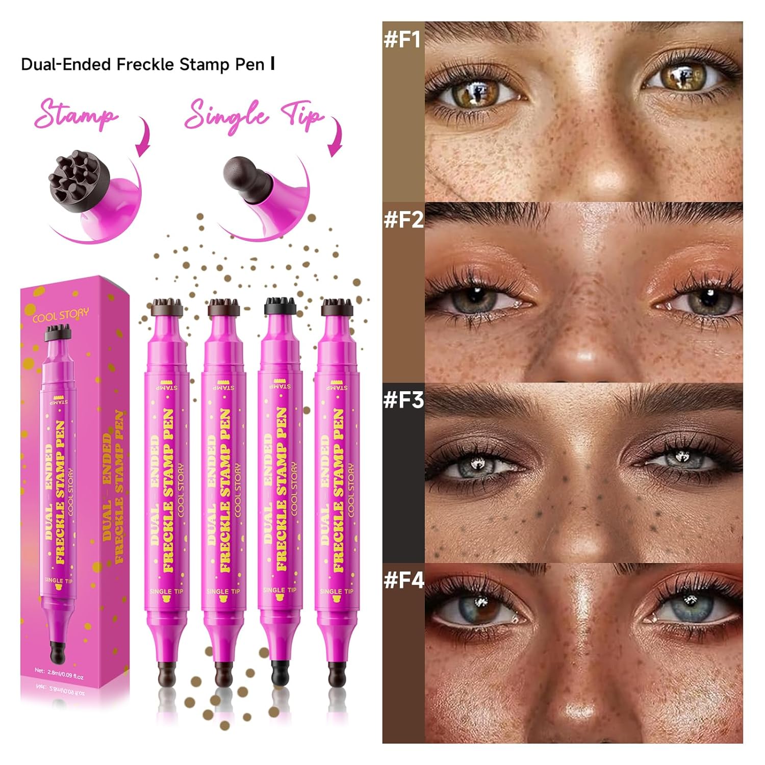 【Two Ways to Freckle – Stamp + Tip Precision】 Dual-ended design lets you create dreamy freckles in seconds—stamp side for scattered clusters, fine tip for customized placement. Ideal for natural beauty or bold festival looks.