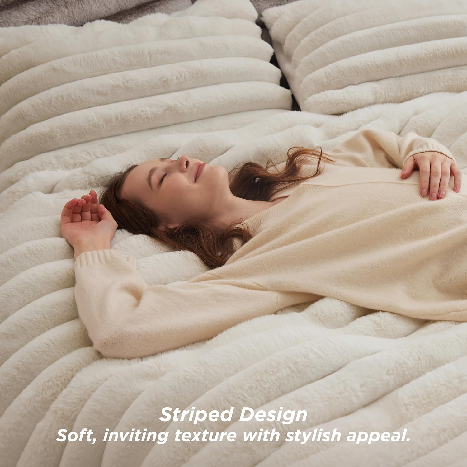 Dual-Texture Comfort: The sleeping side is crafted from solid-color flannel,providing a smooth, warm surface that is gentle against the skin, perfect for a cozy night’s sleep. The other side is made from striped vegan fur, delivering an exceptionally plush and soft texture that adds a luxurious feel to your bedding.