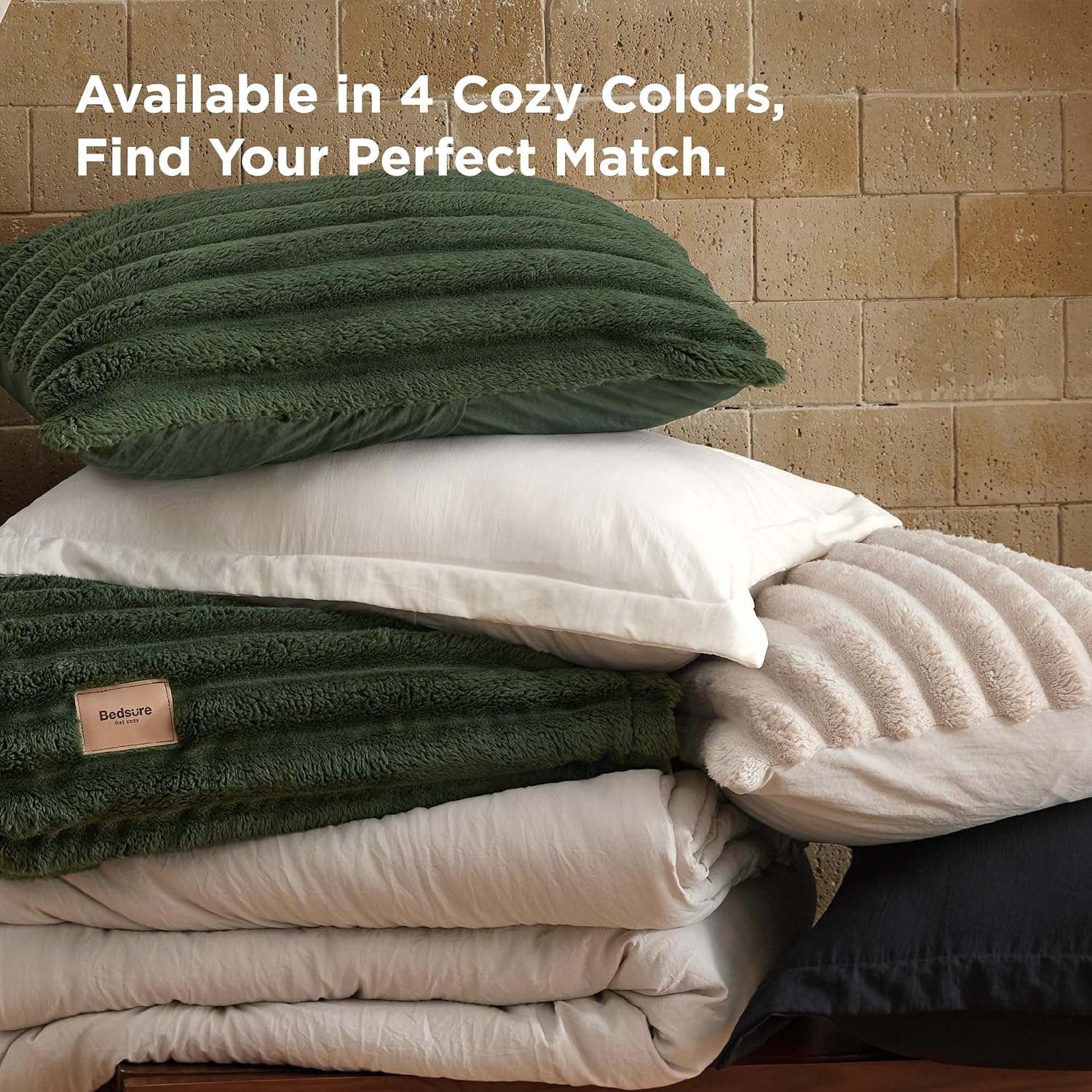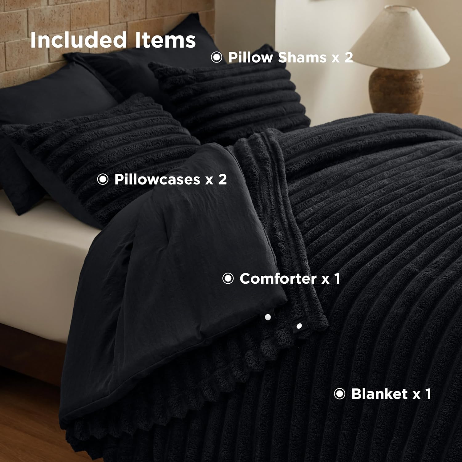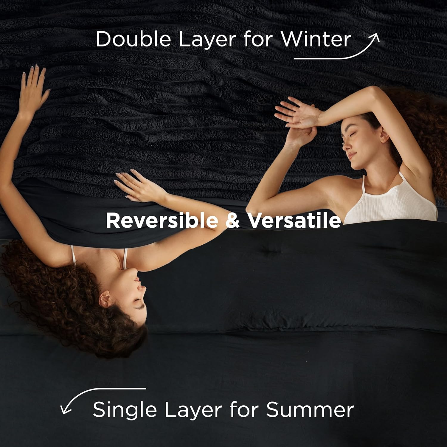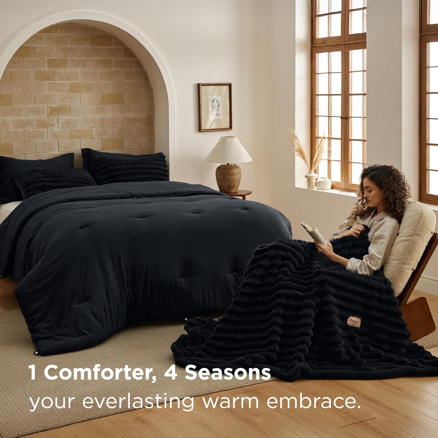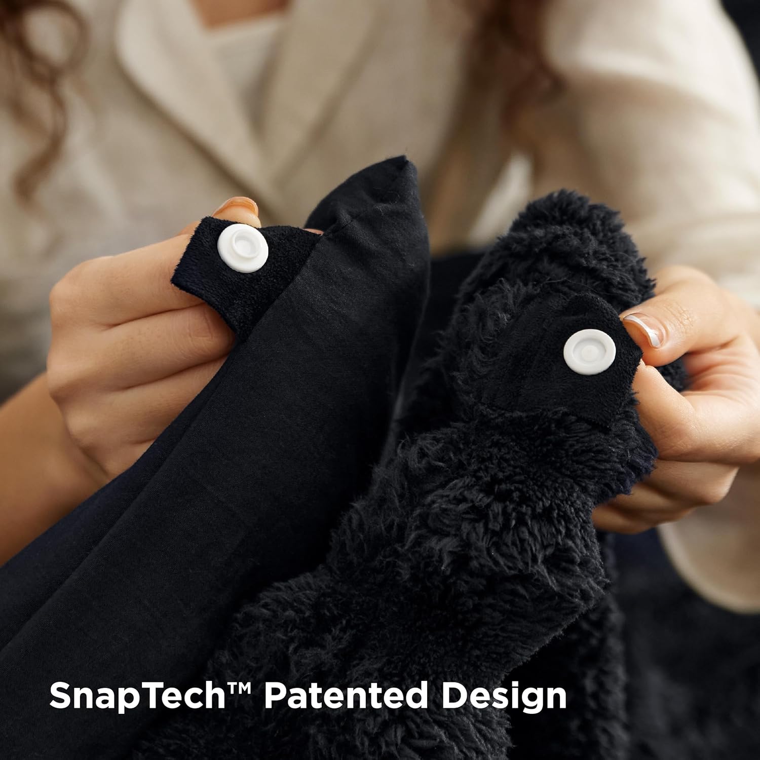 Bedsure Gentlesoft™ 2-in-1 Queen Comforter Set and Detachable Fluffy Blanket, Black Bedding Set for All Season Use, SnapTech™ Design for Space Saving (Includes 2 Pillow Shams, 2 Pillowcases)