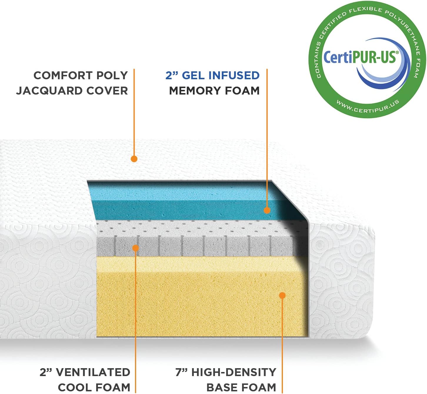 Best Price Mattress 11-Inch Signature Gel Memory Foam Mattress is a household essential that provides the ultimate rejuvenating sleep experience while helping you sleep fresh with its cooling gel infusion. With thousands of gel beads and a layer of ventilated foam, this mattress works to help mediate trapped body heat while increasing ventilation and generating airflow. The memory foam’s pressure relief system will bring you total relaxation, while providing the ultimate support in key areas throughout your body. The cooling gel-infused memory foam and ventilated foam layers are supported by 4 inches of high density base foam for the perfect medium firmness. These layers are then wrapped in a comfort poly jacquard cover, rolled and packaged compactly to be delivered straight to your door. All our mattresses are made with CertiPUR-US certified foams and come with a 10-year limited manufacturer’s warranty.
