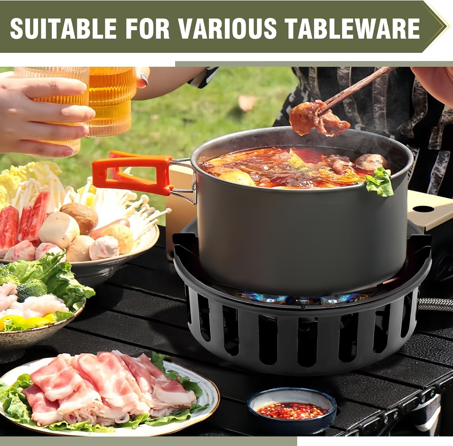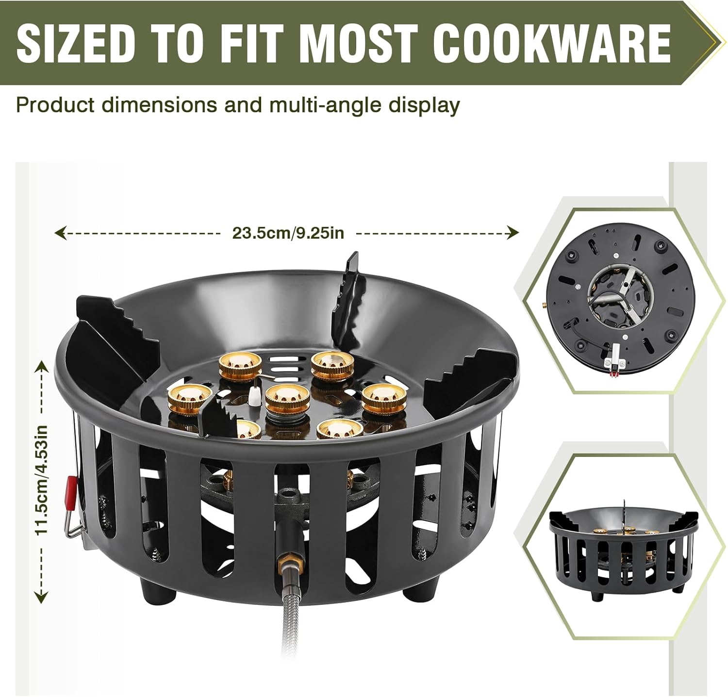 【Extended Hose & Anti-Slip Stability】Comes with a 59-inch extended hose for safe distance from the gas source. The serrated anti-slip pot rack and stepped stand accommodate cookware from 6.3″ to 15.7″, ensuring stable and secure cooking outdoors.