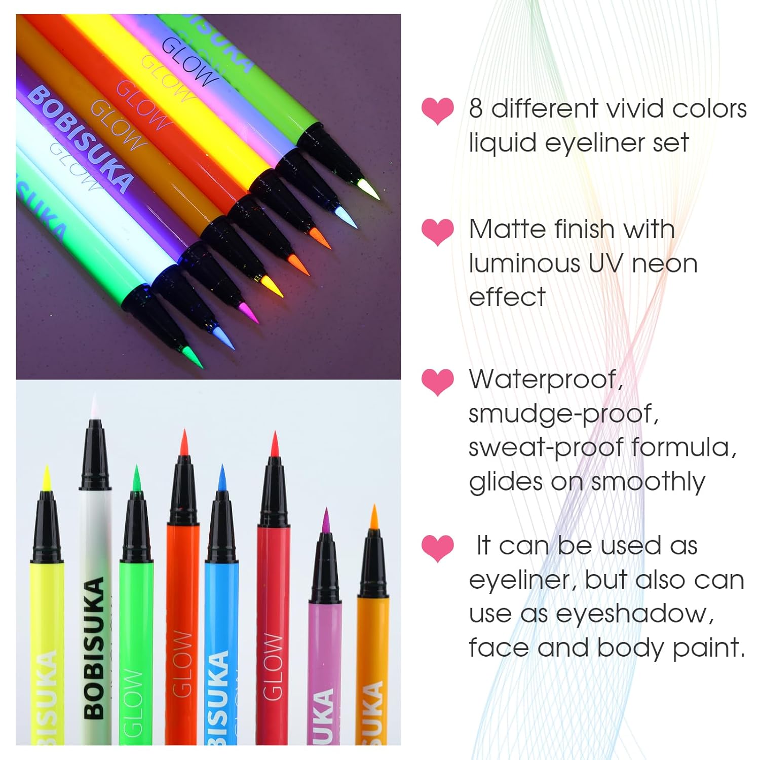 [UV NEON MULTICOLOR] THIS PRODUCT NEED UV LIGHT!!! This reflective eyeliner set includes 8 vivid colors: Pink, Blue, Orange, White, Yellow, Green, Ginger and Purple. Highly pigmentation provides bright, intense colors which will look gorgeous on any surface! Unlike the most eyeliners on the market, these neon liquid liner provide amazing glow under UV light!