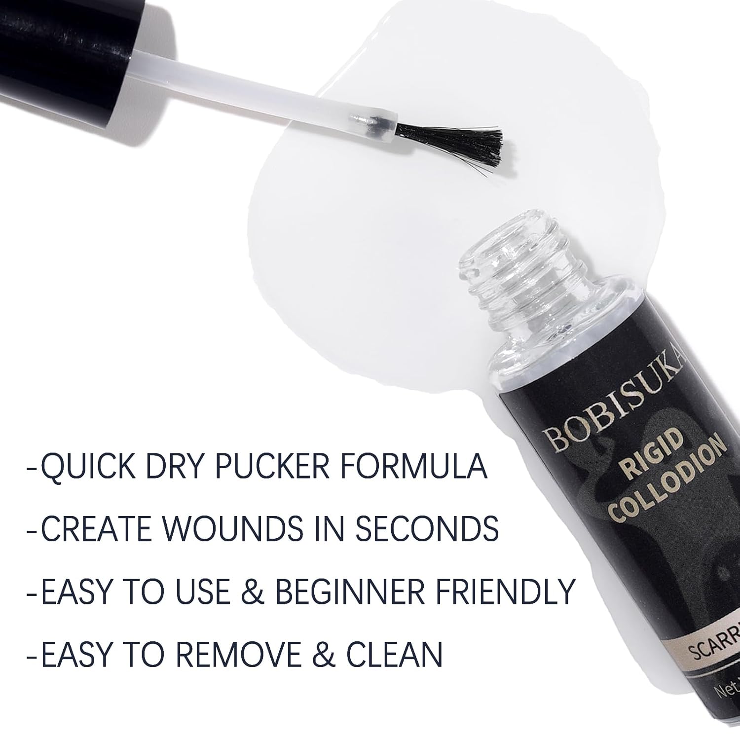 【REALISTIC SCARRED LOOKS】Clear scarring liquid dries and puckers the skin to create amazing scar looks. Quick- drying , formulated to stay in place and pressed together to form a fold easily. Enhance the depth and dimension of your makeup by applying multiple coats of our scarring liquid to meet desired effect. Let our long-lasting formula keep your scar effect intact throughout the parties and event.