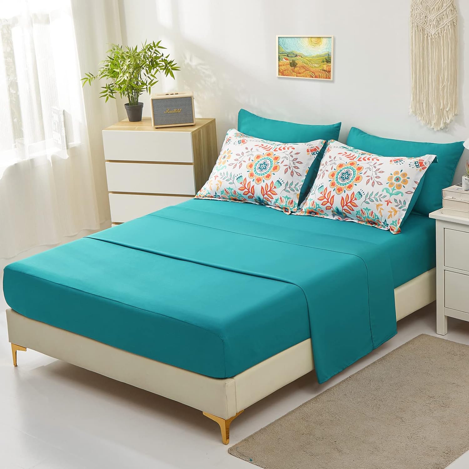 Easy Care: Our turquoise bed in a bag is packaged in a vacuum bag, so you can dry it in low heat or tap the comforter gently while baking it in the sun to fluffy again. The bedding comforter sets are machine washable which can save us more time and energy. It’s highly recommend to wash it in the gentle cycle with cold water, sun-dry or tumble dry in low.