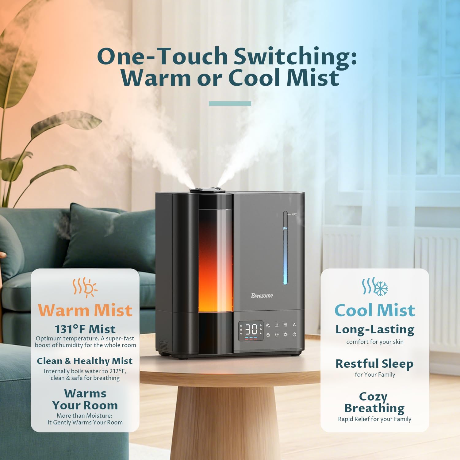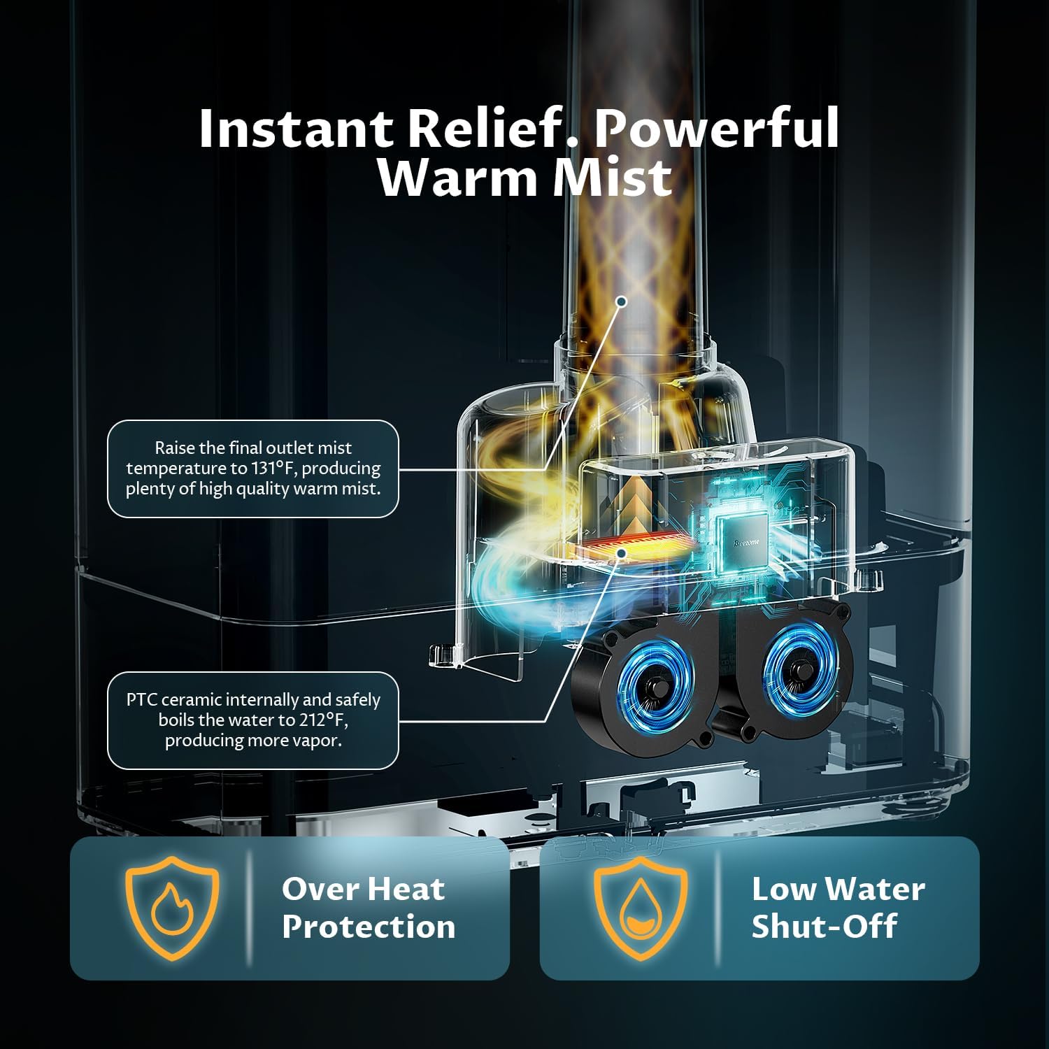 Massive 8L Capacity for Long-Lasting Comfort: Say goodbye to frequent refills! Designed with a 8L water tank, our wam and cool mist humidifier for large room can maintain a long lasting operation up to 65h(in lowest mist setting). Enjoy continuous comfort throughout long nights and busy days.