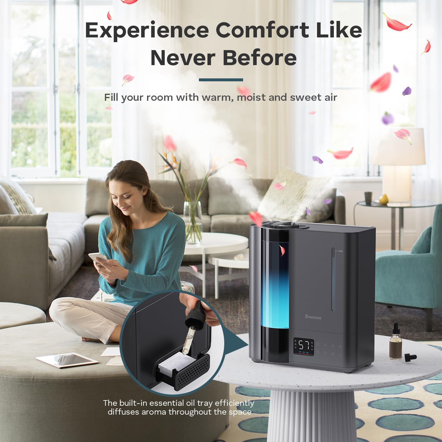 Smart Auto Mode: Set it and forget it! Equipped with an intelligent humidistat, our humidifier automatically detects room humidity and auto-adjusts mist to keep levels between 40%–80%. Customize your environment with 3 mist levels and 3 heat settings for personalized wellness.
