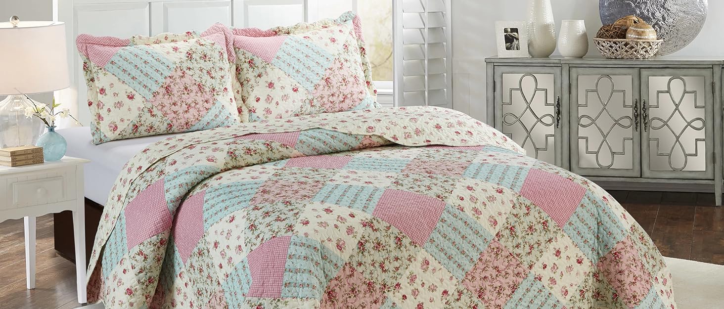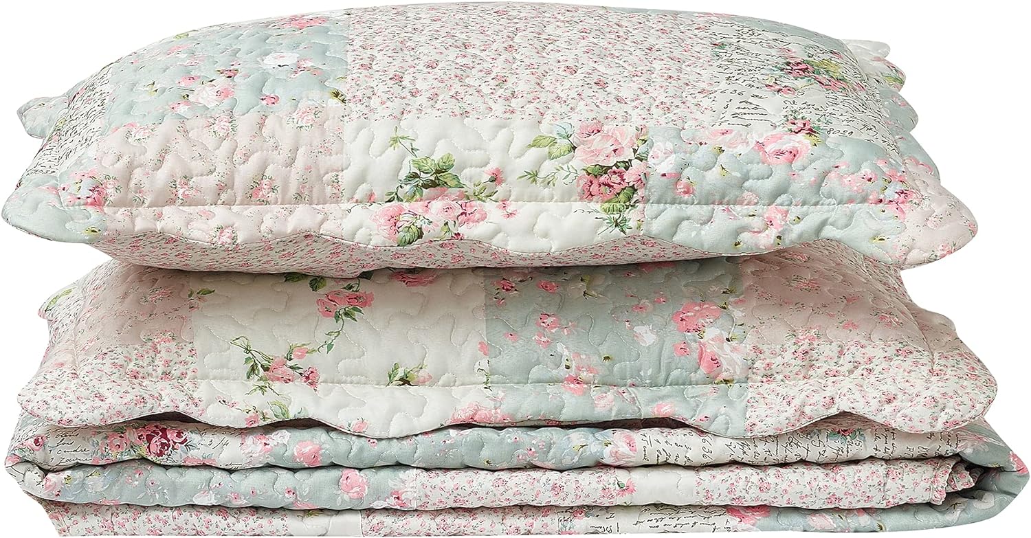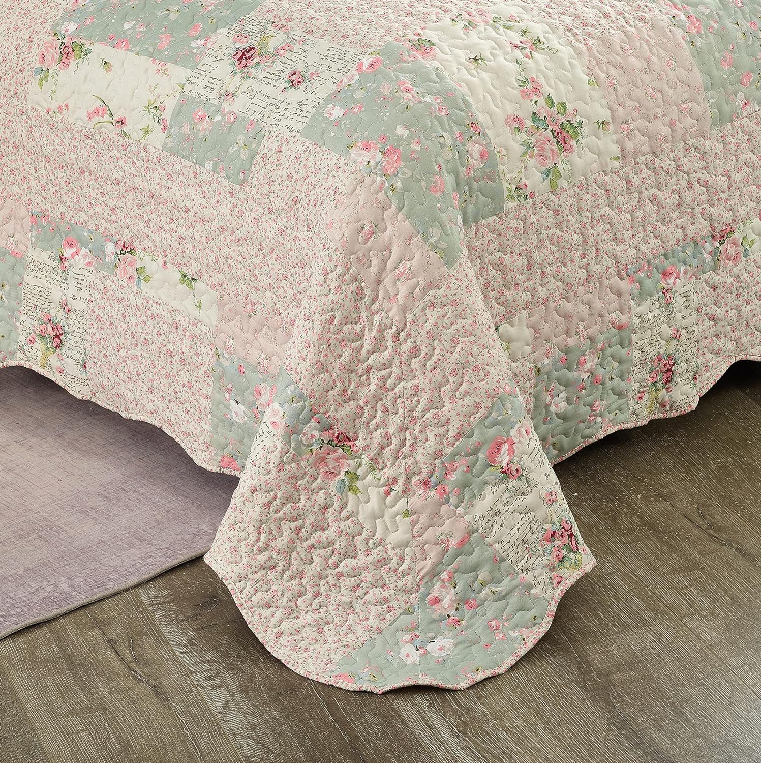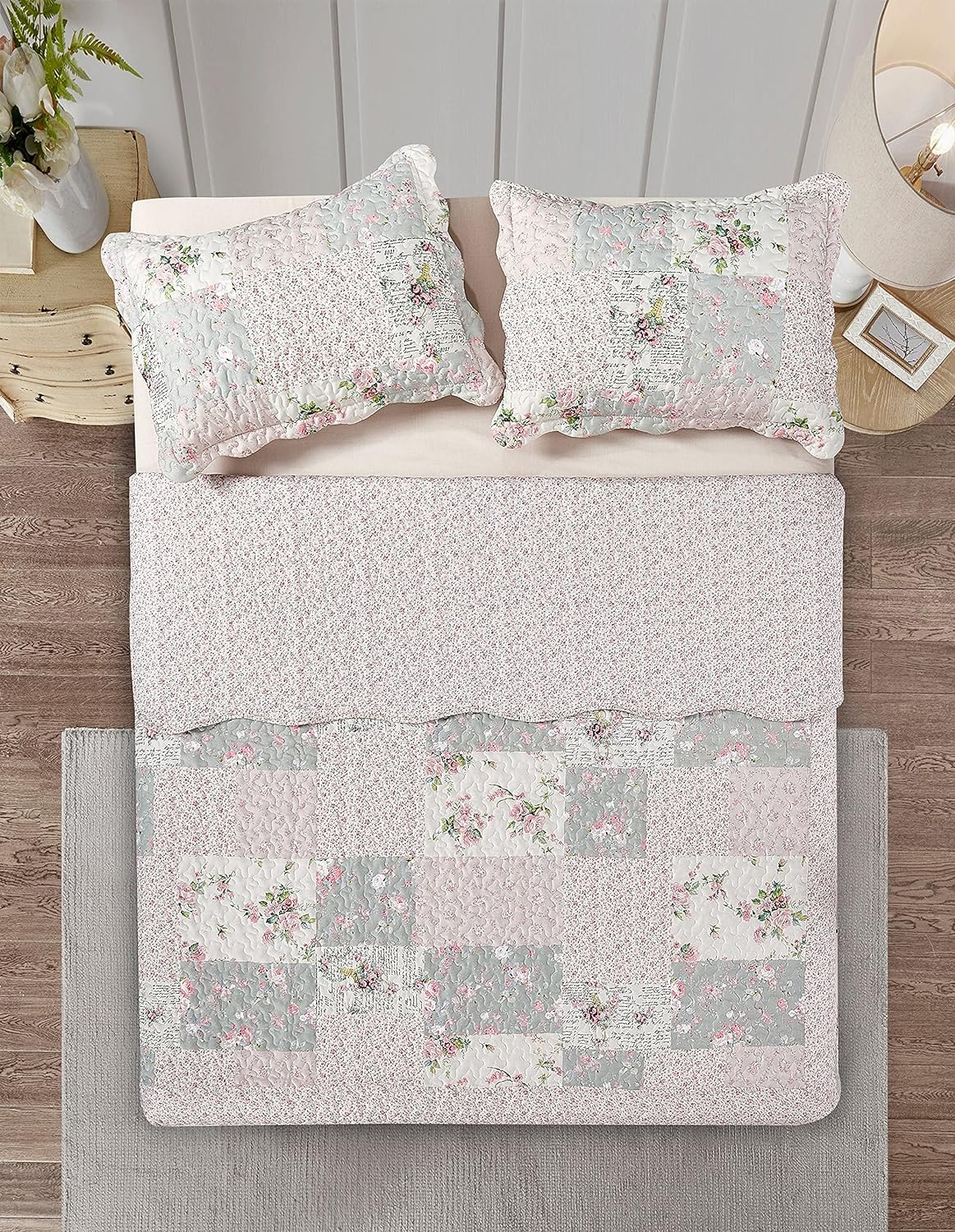 UNIQUE DESIGN: Traditional printed patchwork design in modern shades of rose and sage, with rose bud patch frames, classic, exquisite and unique. Reverse to a coordinating pattern of rose buds. This quilt set will complete your look.