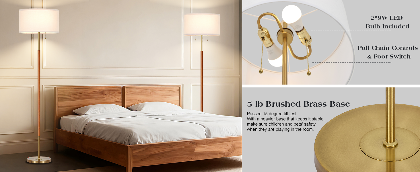 【Foot Switch+Pull Chain Control & 2-Lights with 3 Color Temperatures Bulbs】 Enjoy ultimate convenience with double control: classic Pull Chains and a master Foot Switch—no bending required! Includes 2*9W LED bulbs with 3 color temperatures (3000K/4500K/6000K). Easily adjust this standing light from cozy warm to bright white for working. The dual-switch design makes it the most user-friendly floor lamp for bedroom or reading corners.