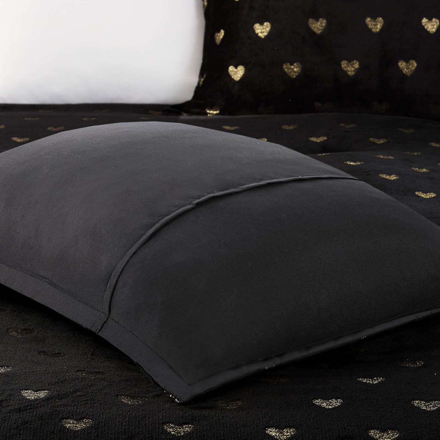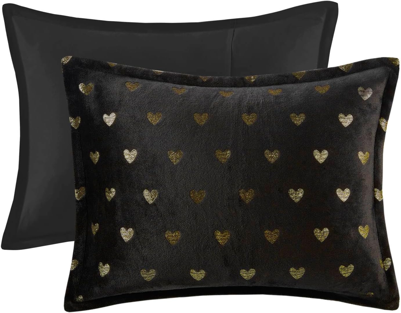 Comforter/Sham: Polyester microlight plush fabric with metallic print, brushed microfiber reverse Fill: polyester Sham with 1″ flange and overlap opening at back Pillow: Polyester brushed microfiber, polyester fill