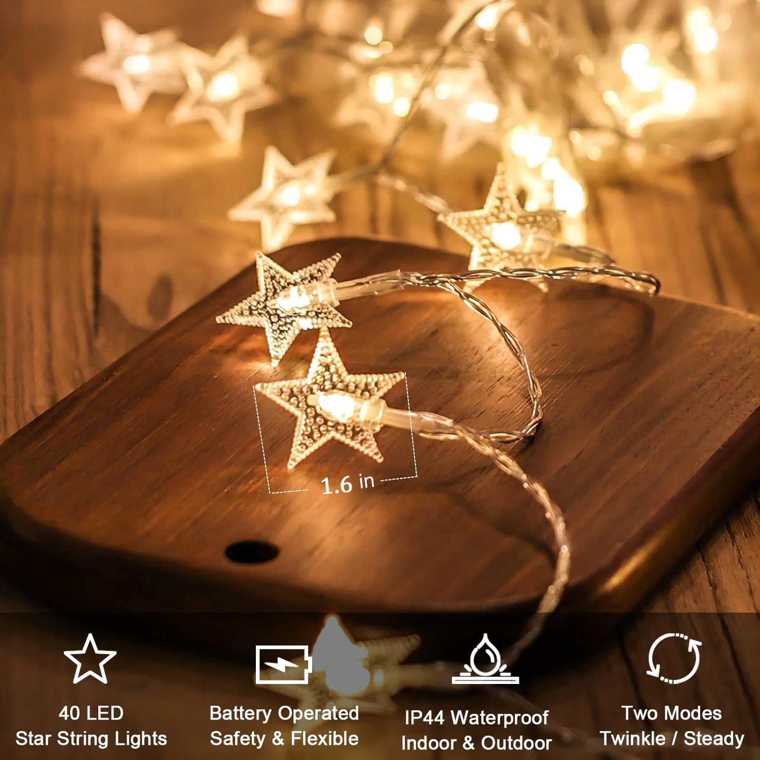 Cute Decorative Star String Lights: 20 FT 40 LED lights, warm white stars, PVC waterproof material; There are two modes of switch: Twinkle/Flash and Steady On; It will brighten up the dark corner for happiness and cozy atmosphere indoor or outdoor