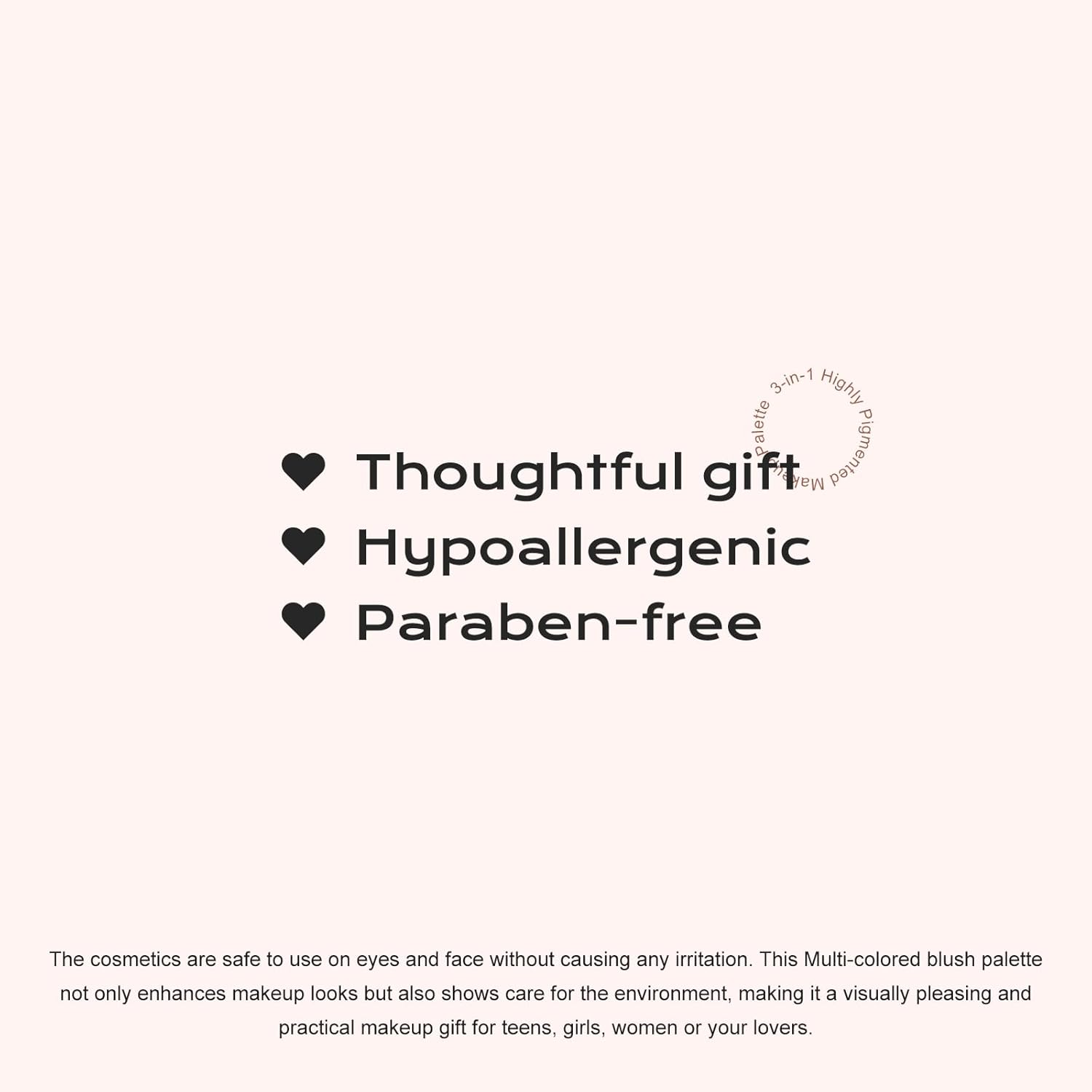 3-IN-1 Makeup Palette — This trio is a stacked, comes with a Blush, Contour and Highlighter in a bite-sized palette.Multi-colored makeup palette is a perfect blend of daily complimentary hues Also as contour to accentuate & enhance cheekbones for a fresh, healthy natural-looking flush.