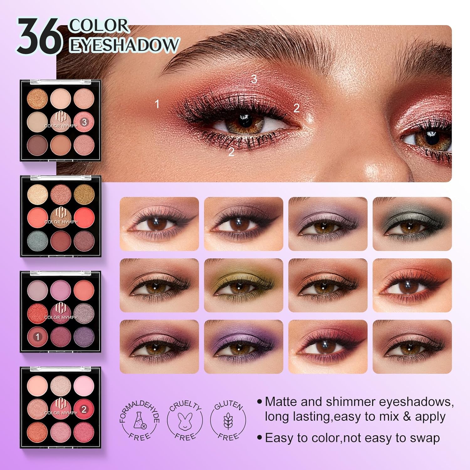 All-in-one Makeup Kit: The women makeup kit included 36 colors matte & pearl eyeshadow powder, 4 colors lip oil, 4 colors eyebrow powder, 4 colors blush palettes, 2 color highlighter, 2 color contouring powder, 4 pcs lip gloss, 1 pcs lip balm, 1 pcs lipliner pencil, 1 pcs eyeliner pencil, 4 pcs makeup brushes, fulfilling your makeup needs to create a flawless look.