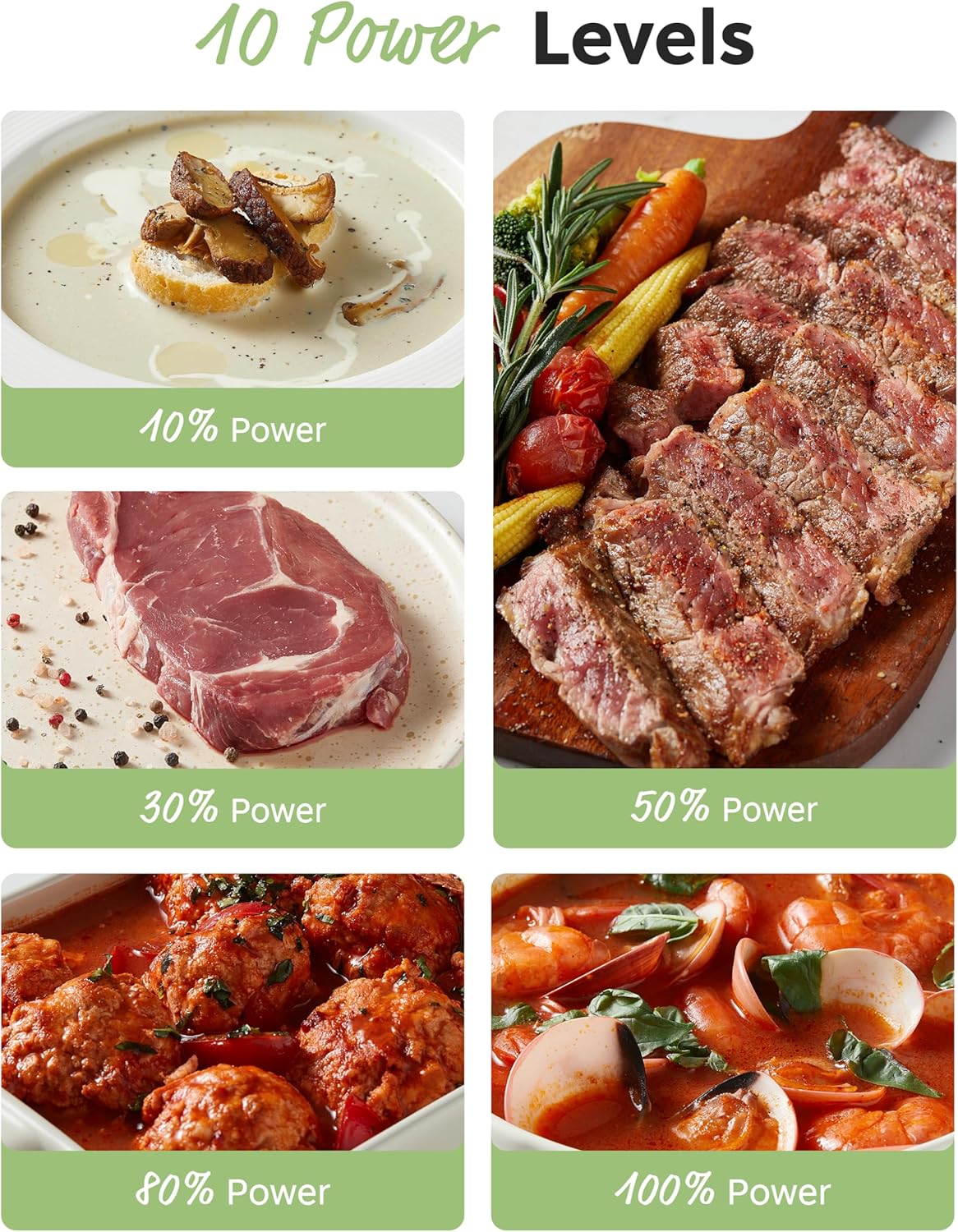 One touch express cooking function with 1-6 minutes and 30 seconds functions, and two defrost settings (by weight or by time)