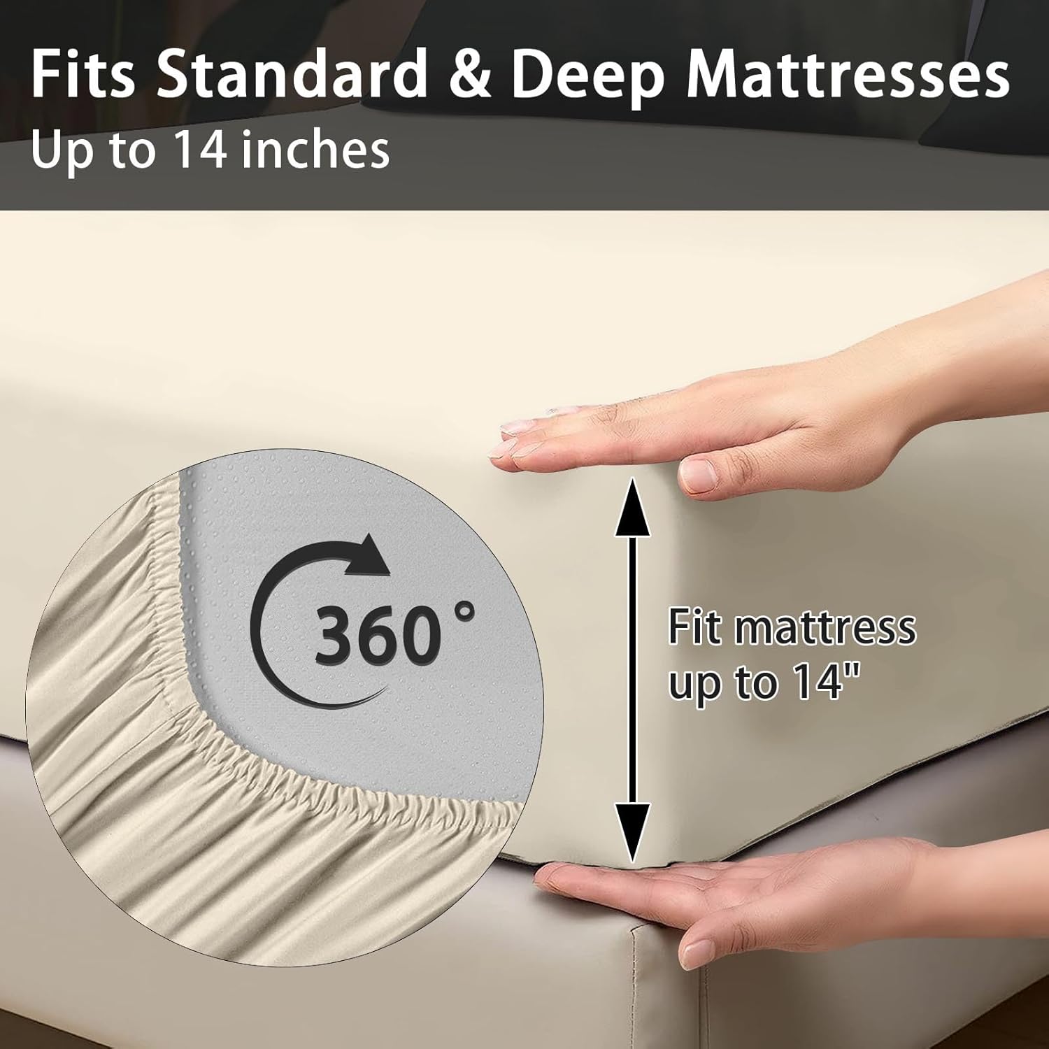 Easy Fit: The Sheet set includes a deep-pocket fitted sheet designed with an elastic band on all four sides, accommodating mattresses up to 14 inches thick. The elastic band around the edge ensures a secure fit, keeping the sheet in place all night long.