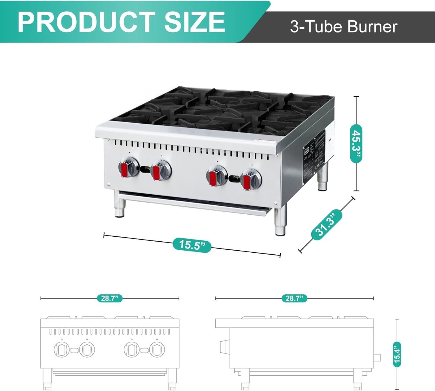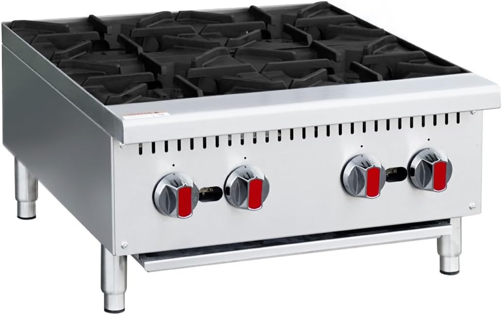 Elevate your commercial kitchen capabilities with this powerful 4-burner gas stove from ZENITHLIVING. This heavy-duty countertop range delivers impressive performance with four independently-controlled 25,000 BTU burners, totaling 100,000 BTU of cooking power. The robust stainless steel construction ensures durability in demanding kitchen environments, while the cast iron grates provide excellent heat distribution and easy cleaning. Each burner features a standing pilot light for reliable ignition and adjustable manual controls for precise temperature management. The unit’s practical dimensions (28.68″ L x 23.99″ W x 13″ H) make it ideal for commercial kitchens, restaurants, and food service operations. The full-width crumb tray is removable for hassle-free maintenance, and the built-in aeration bowls help maintain consistent heat distribution. This versatile cooking station combines professional-grade performance with user-friendly operation, making it an essential addition to any commercial kitchen setup.