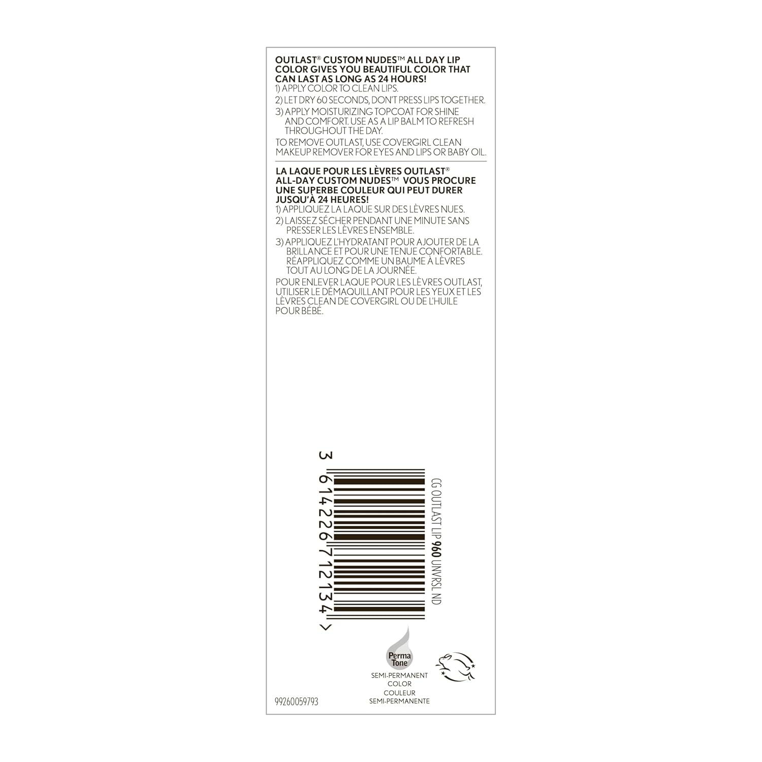 Bring out your own beautiful lip color with Covergirl Outlast All-Day Lip Color Custom Nudes. This formula keeps lips looking and feeling fresh for up to 24 hours. The nourishing topcoat with sunflower seed oil provides instant moisture for soft, shiny lips. Enhance your own natural lip color by finding the right nude shade to match your skin tone. Pro-tip: Pair with any Covergirl Outlast foundation for an all-day, worry-free look.