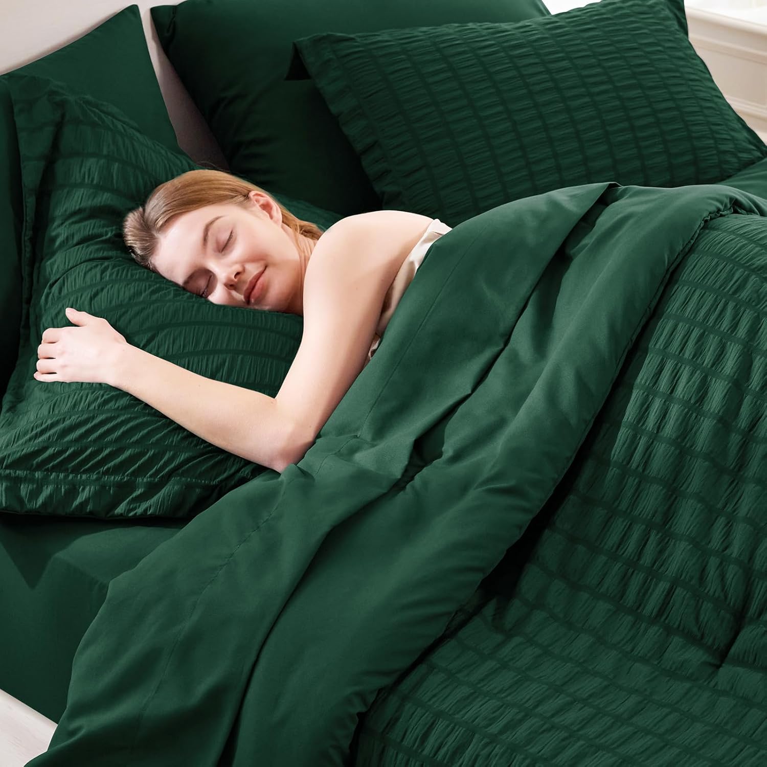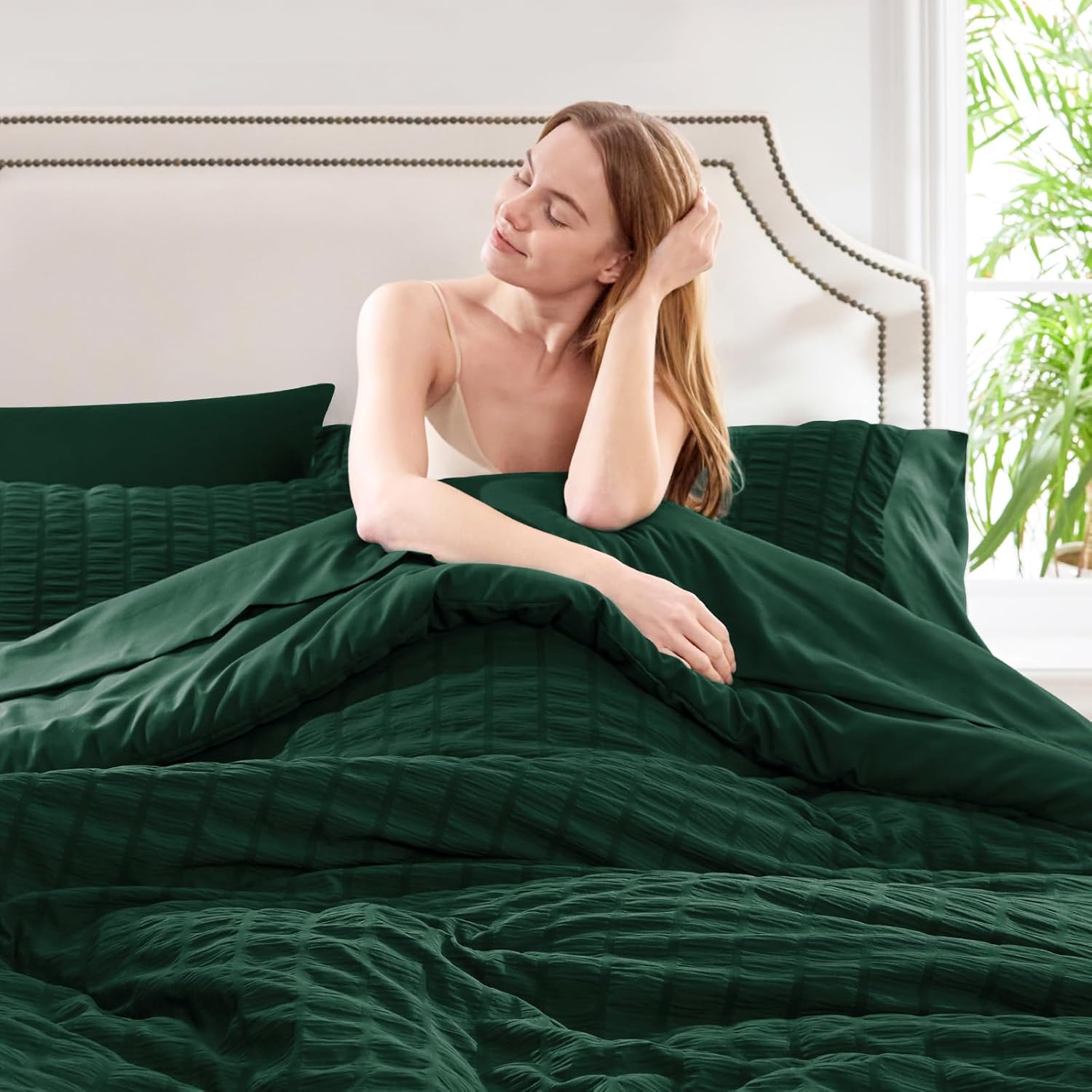 CozyLux Full Size Comforter Sets with Sheets Seersucker 7 Pieces Emerald Green Bed in a Bag Textured Luxury Soft Bedding Set with Down Alternative Comforter, Sheets, Pillowcases & Shams for All Season