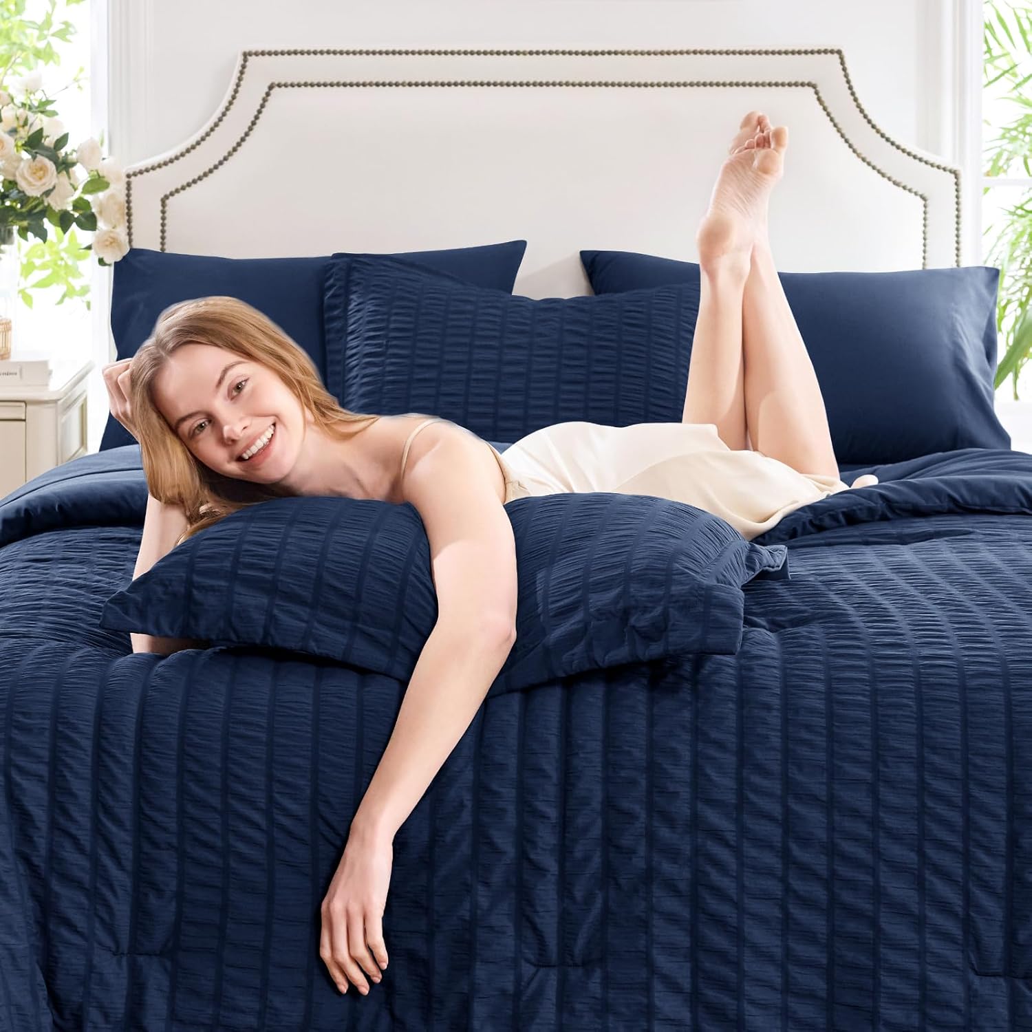 CozyLux Full Size Comforter Sets with Sheets Seersucker 7 Pieces Navy Blue Bed in a Bag Textured Luxury Soft Bedding Set with Down Alternative Comforter, Sheets, Pillowcases & Shams for All Seasons