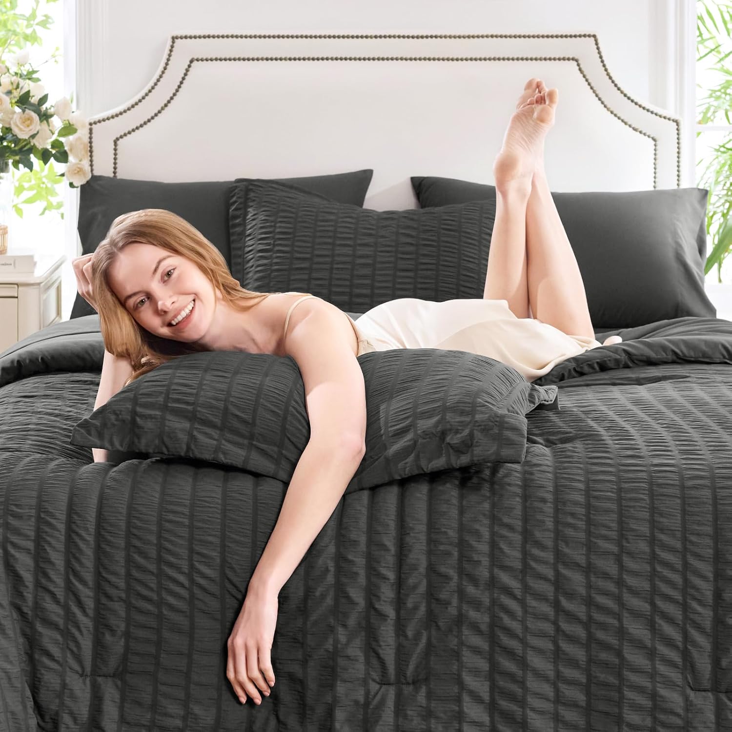 CozyLux King Size Comforter Set Dark Grey Seersucker 7 Pieces Bed in a Bag King Comforter Set with Sheets, Luxury Bedding Set with Down Alternative Comforter, Sheets, Pillowcases & Shams All Seasons