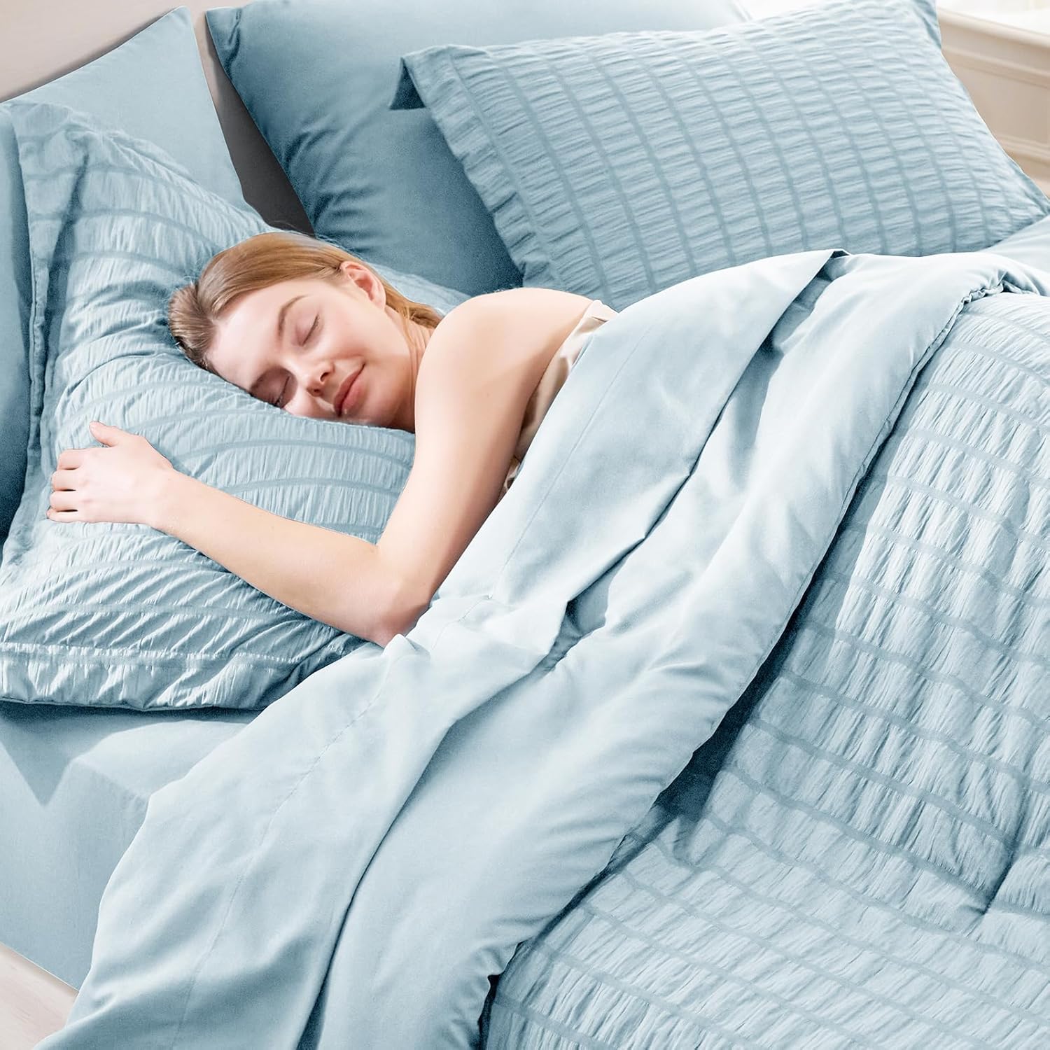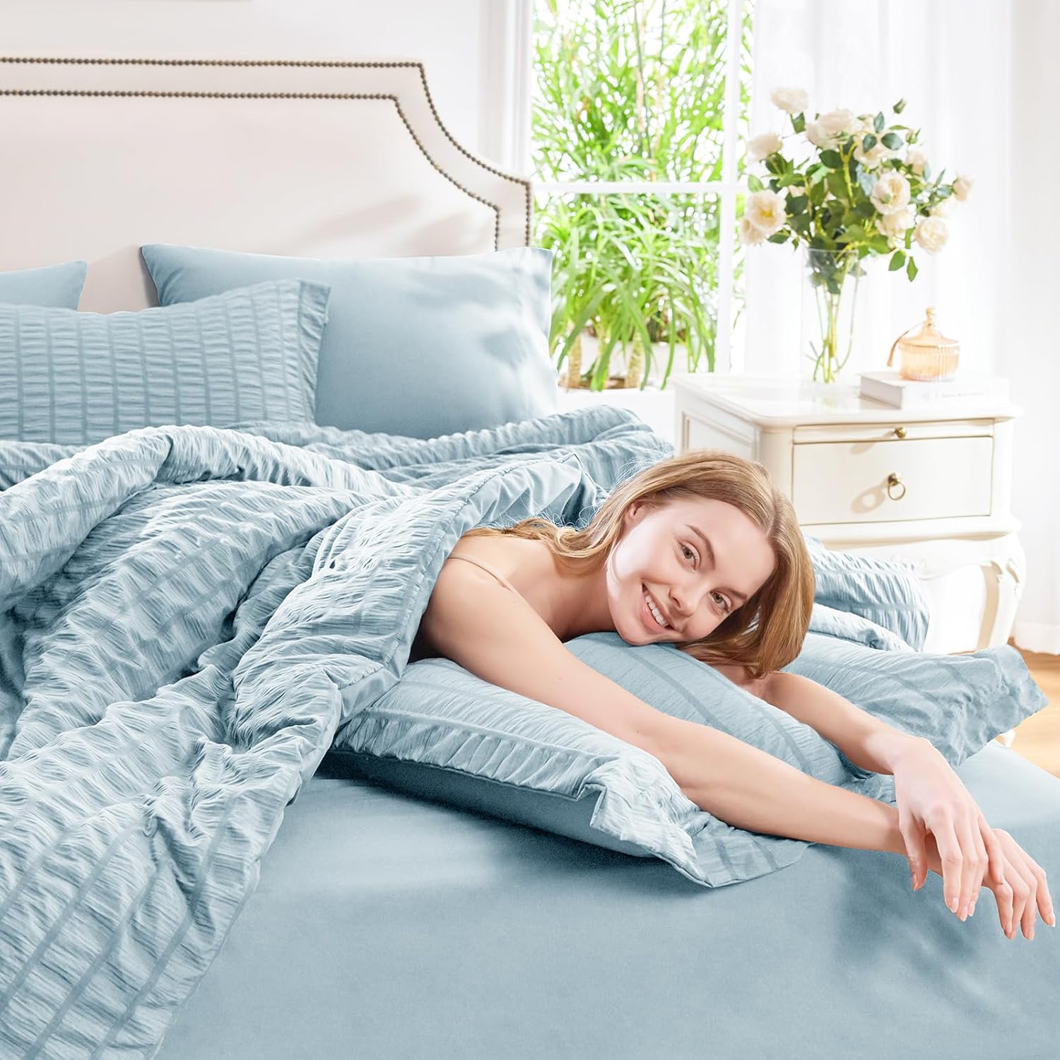 Adorned with a classic seersucker texture on soft white fabric, the chic bedding brings an unique touch of style to your bedroom decor.