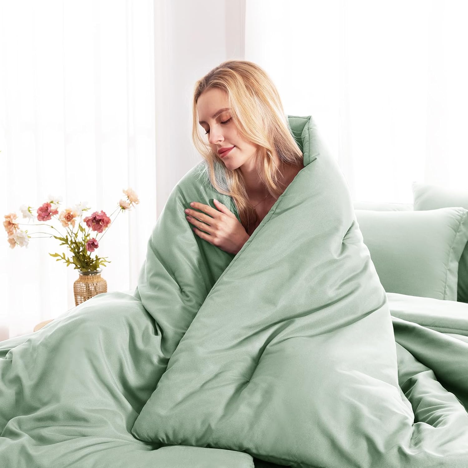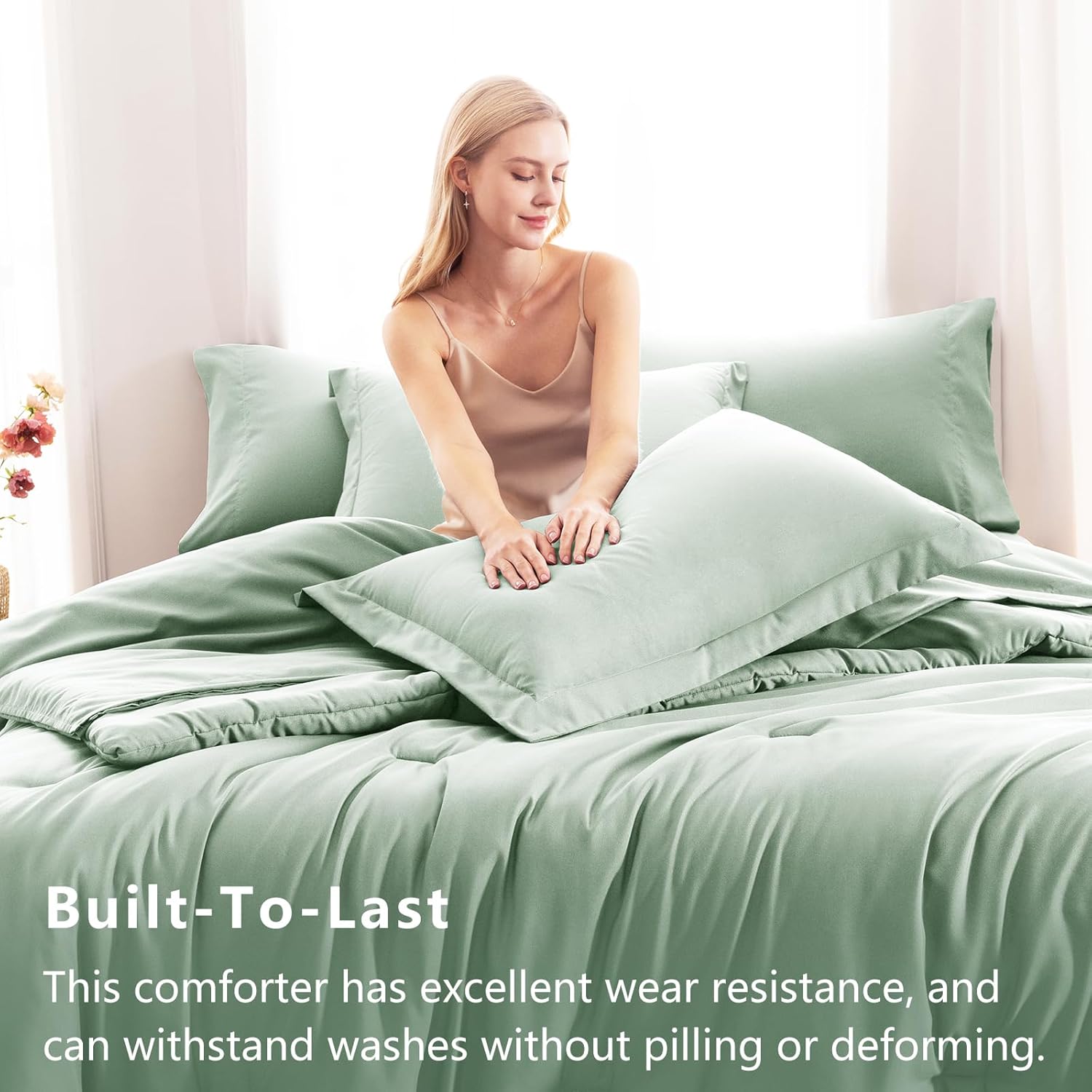 【Easy Care】Machine wash cold on gentle cycle with like colors. Tumble dry low. Do not bleach. No pilling, no shrink, no fade, iron on low heat if needed. Since the comforter comes in vacuum-sealed packaging, it is highly recommended to wash it and tumble dry low temperature to puff the comforter before first use. Or you can expose it to sunlight and tap gently, then it will re-fluffed nicely after hours.