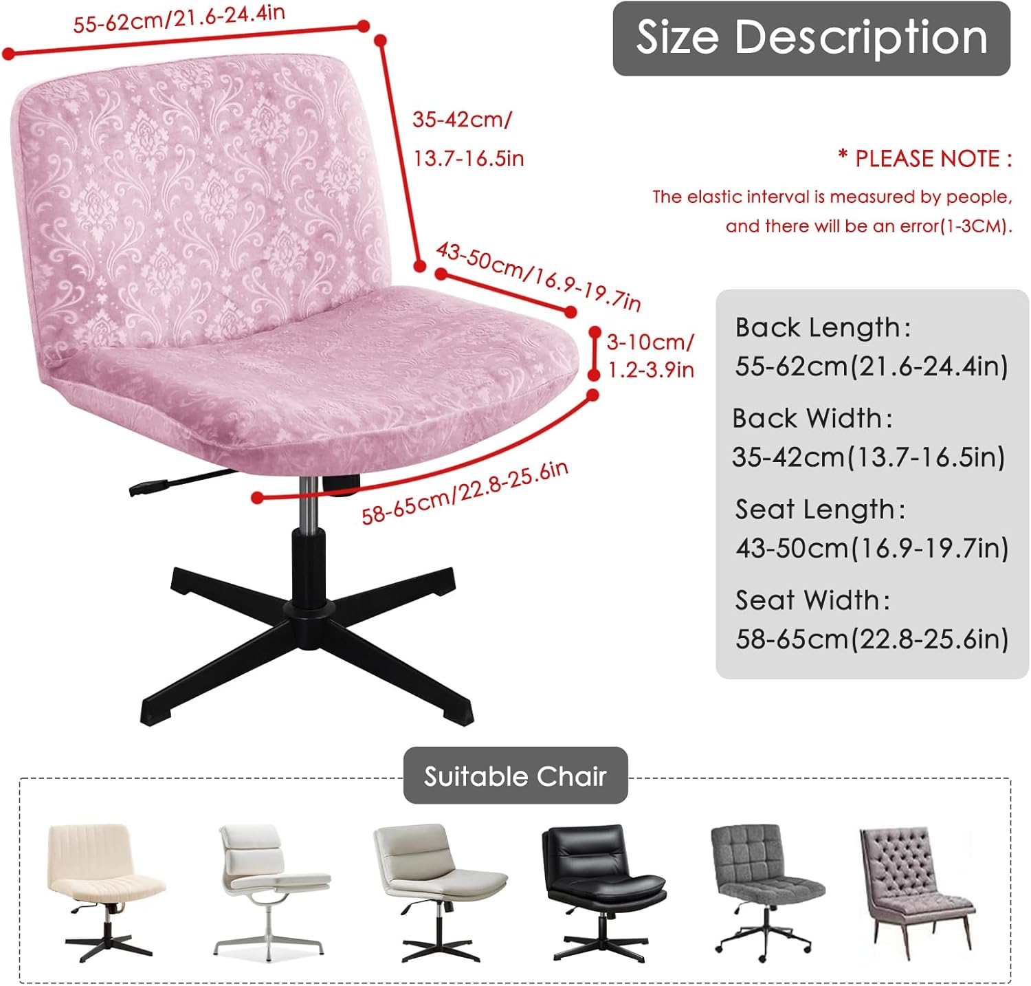 [Recommended Size For Criss Cross Chair Cover]: Back Width:55-62cm/21.6-24.4inch;Back Height:35-42cm/13.7-16.5inch;Back Thickness:3-8cm/1.2-3.1inch;Seat Width:58-65cm/22.8-25.6inch;Seat Depth:43-50cm/16.9-19.7inch;Seat Thickness:3-10cm/1.2-3.9inch. Before ordering the Armless office chair covers, please carefully measure the size of your chairs, and make sure it’s within the recommended size.