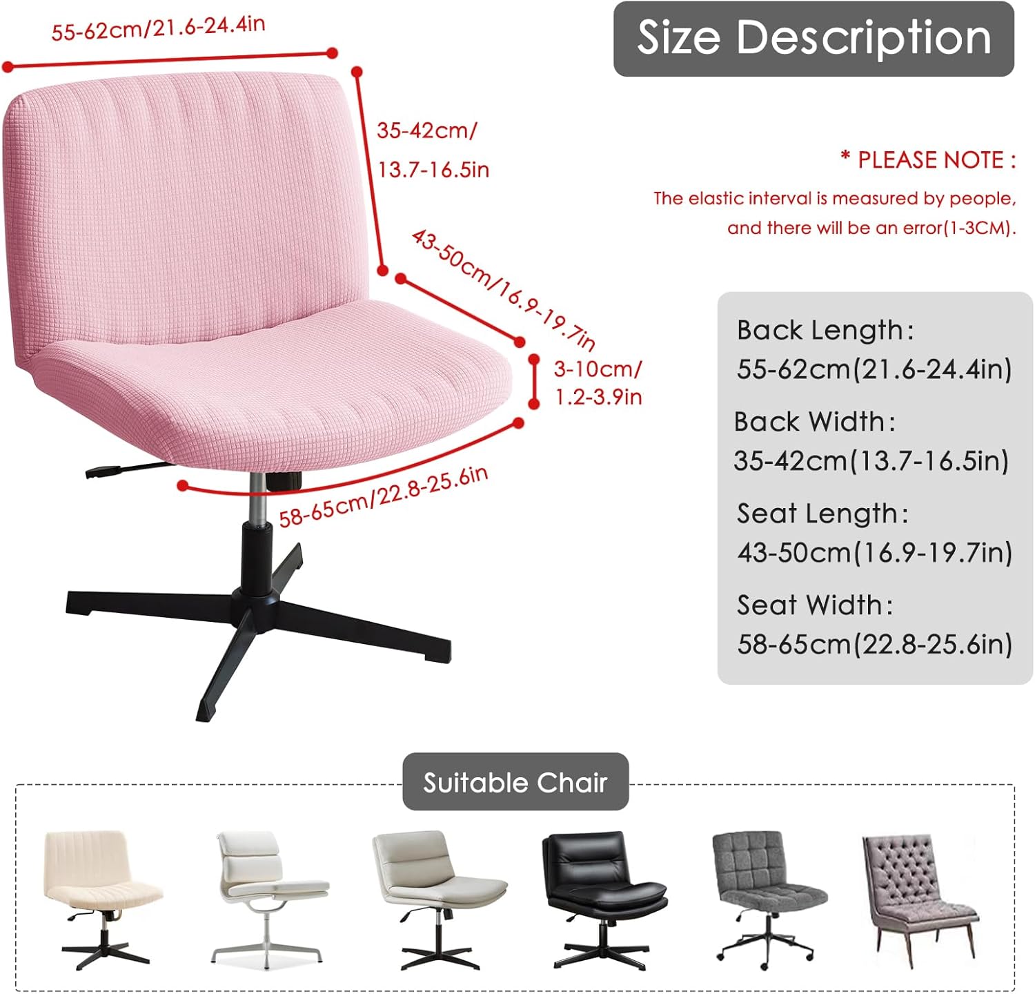 [Recommended Size For Criss Cross Chair Cover]: Back Width:55-62cm/21.6-24.4inch;Back Height:35-42cm/13.7-16.5inch;Seat Width:58-65cm/22.8-25.6inch;Seat Depth:43-50cm/16.9-19.7inch;Seat Thickness:3-10cm/1.2-3.9inch. Before ordering the Armless office chair covers, please carefully measure the size of your chairs, and make sure it’s within the recommended size.