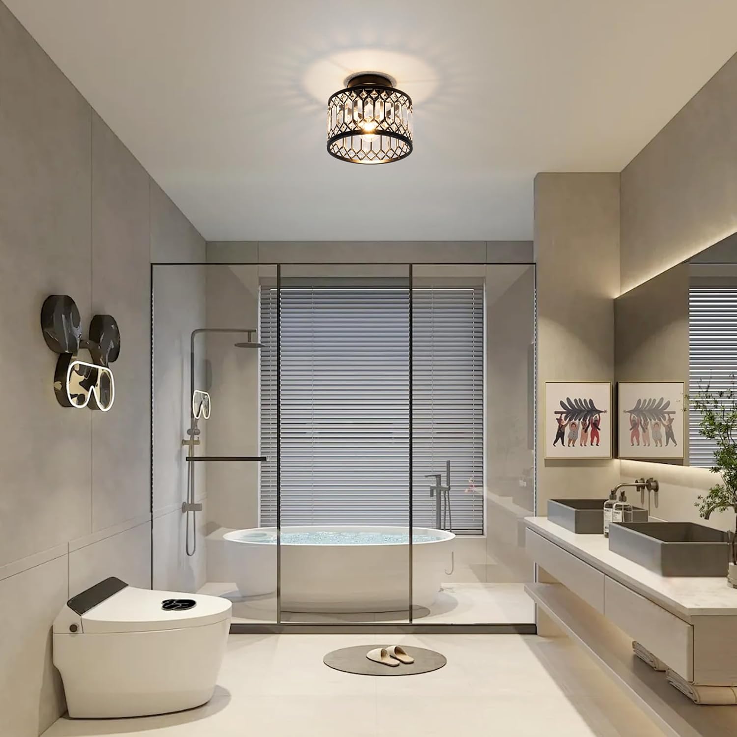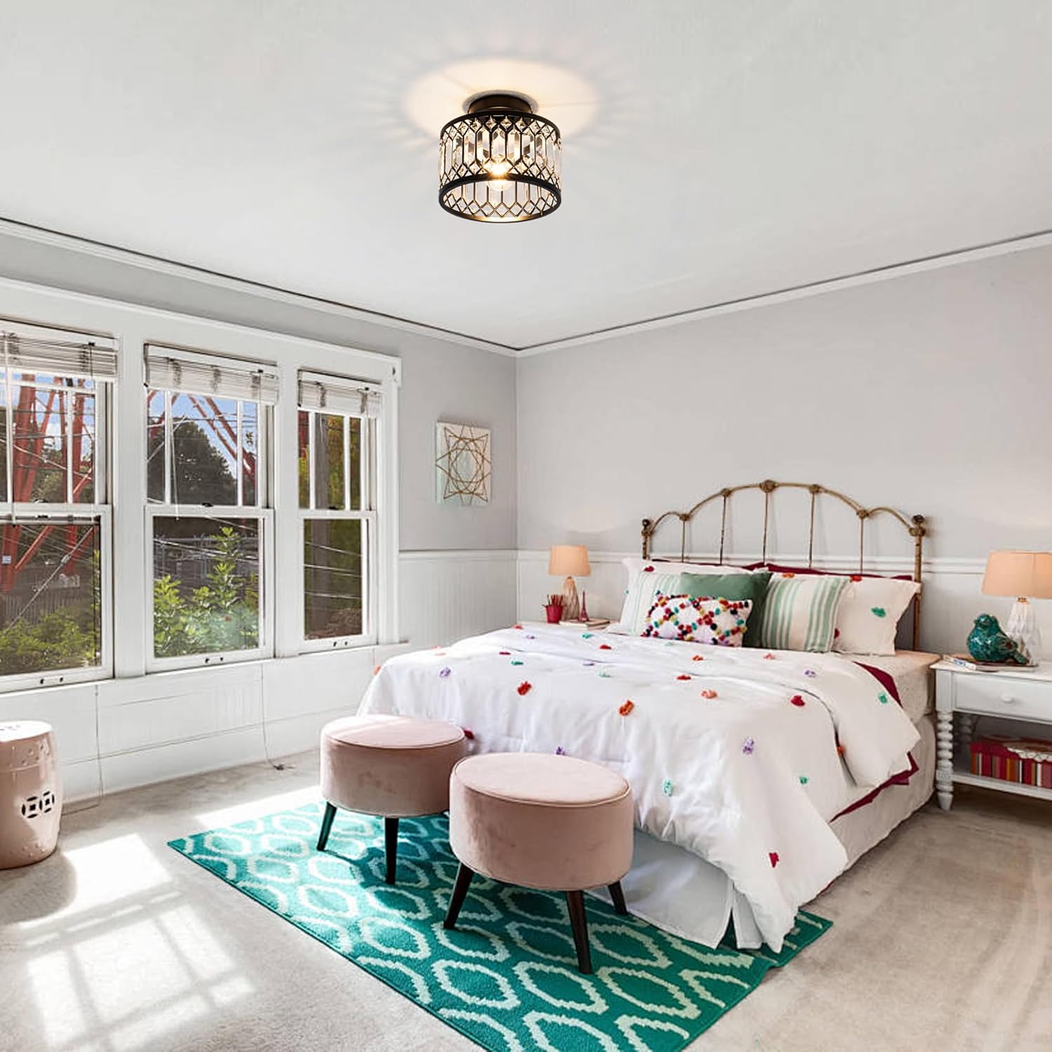 【Crystal Flush Mount ceiing light Design】This Modern Flush mount ceiling light features Black frame with crystal shade.The round metal construction and clear crystal decoration make this modern crystal chandelier simple and luxurious yet elegant,while also reflecting the colorful light around the room in a clever way. Creating a comfortable and elegant atmosphere in your home.