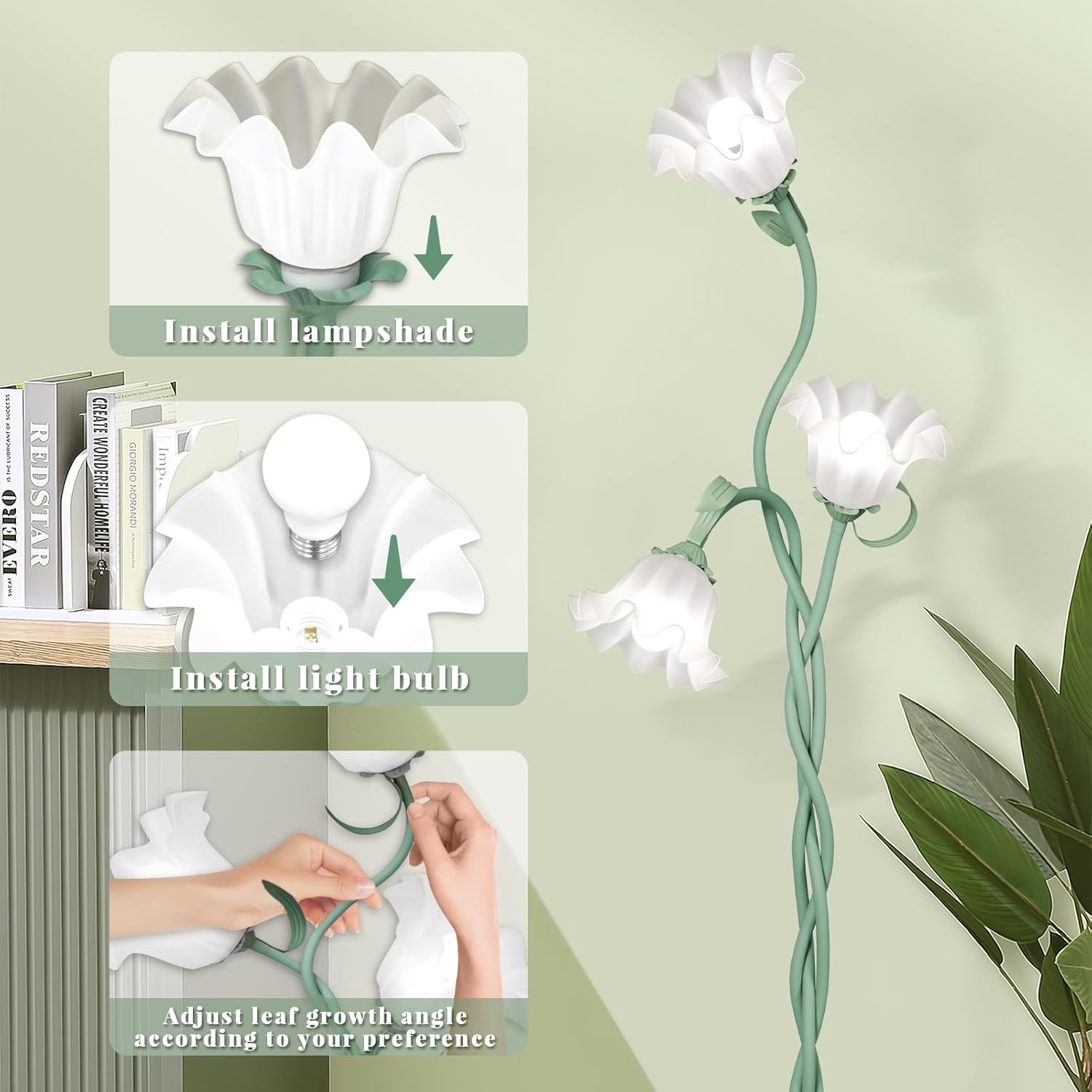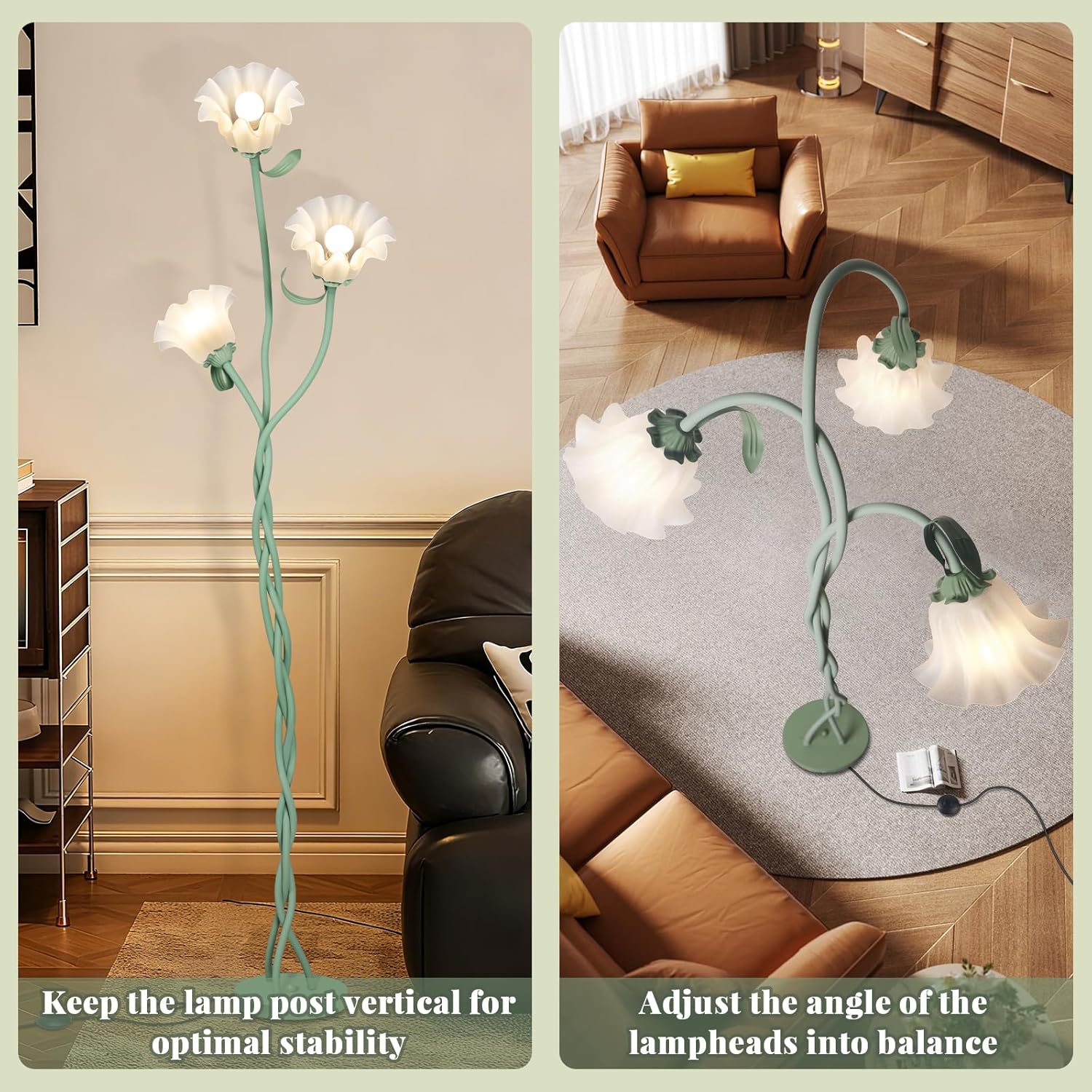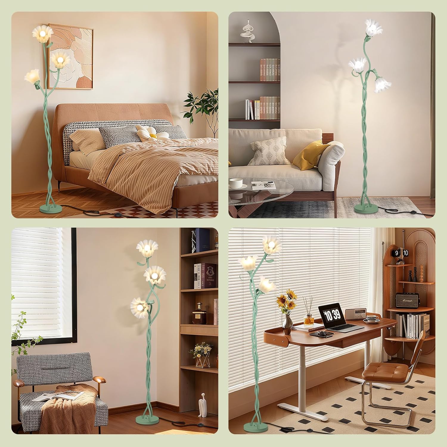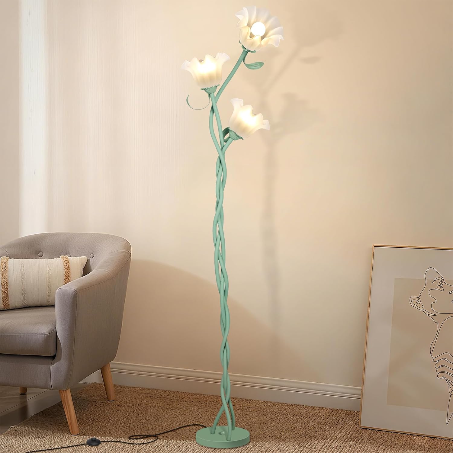 Cute Flower Floor Lamp for Bedroom, 3 Heads LED Tall Standing Lamp with Flexible Gooseneck, 3 Color Temperatures Corner Lamp for Girls Room, Kids, Home Decor(Green)