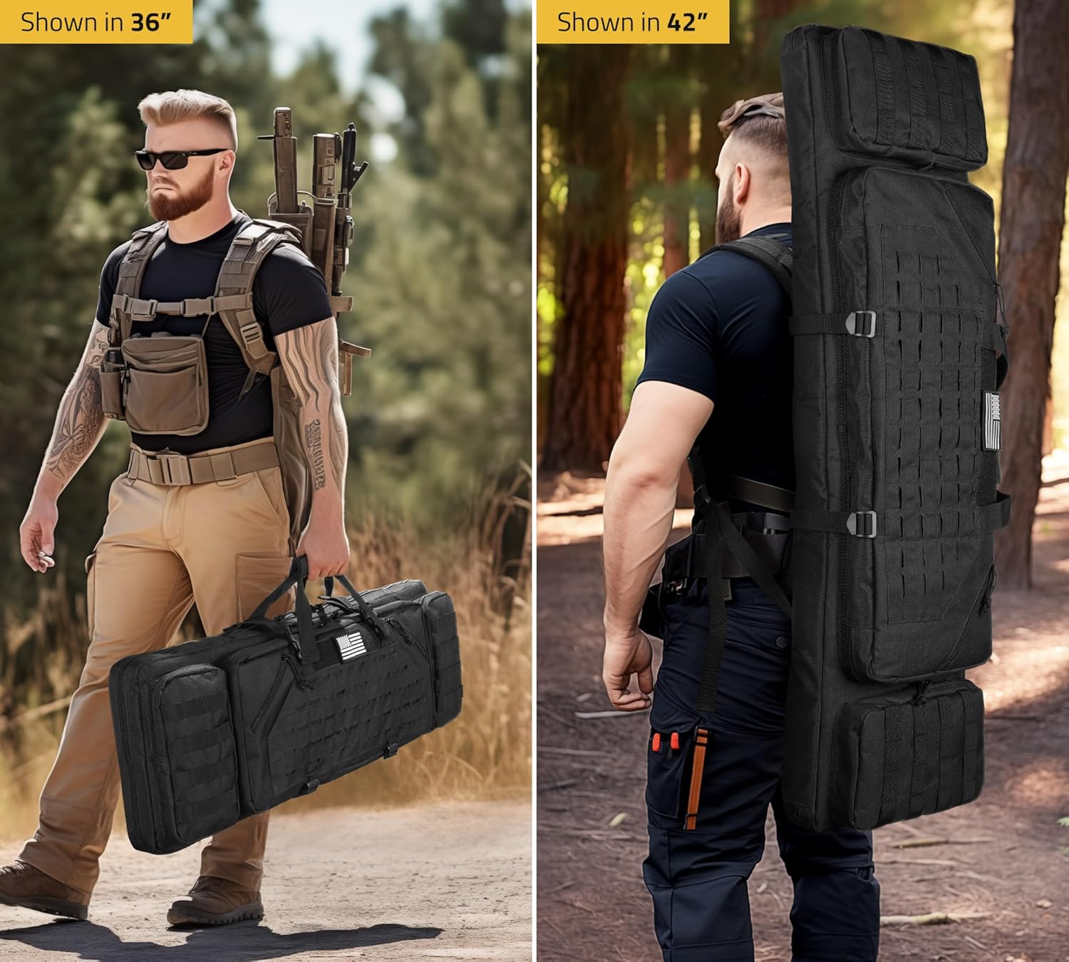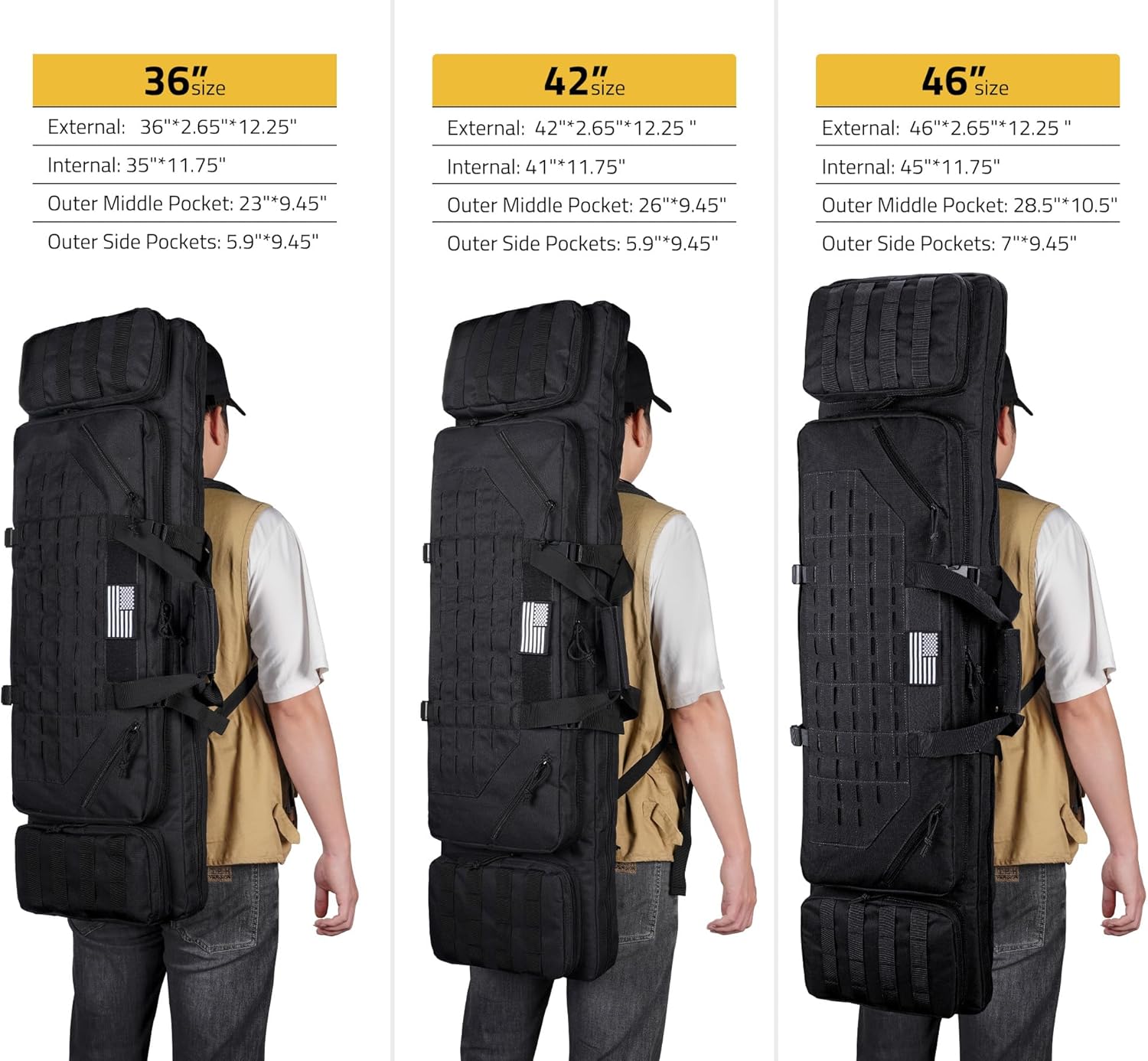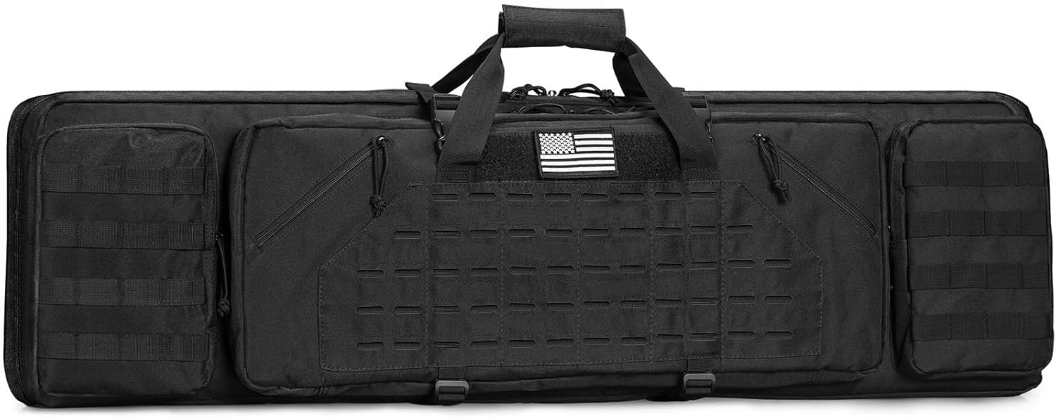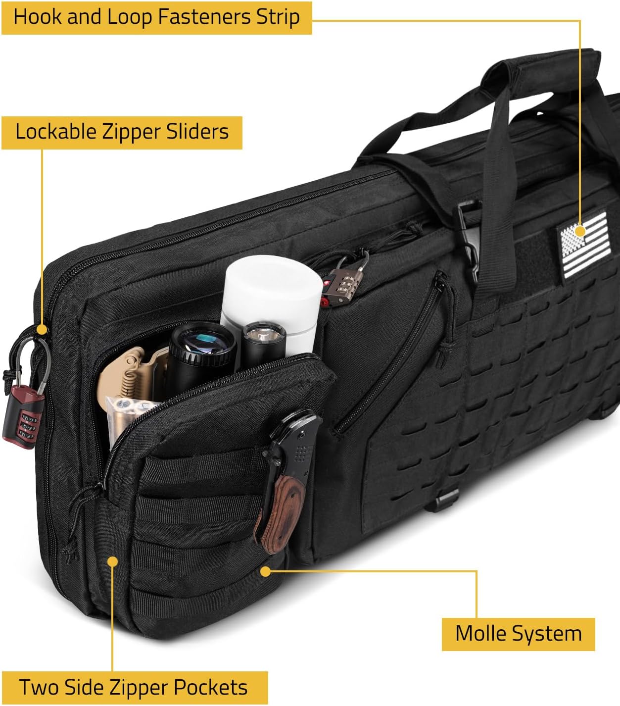 Ultra Spacious and Safe: The dimensions of this gun bag are 36″ L x 12″ H. The main compartment of this double rifle case can accommodate two long rifles and two pistols. There are additional secondary compartments and small pockets on both sides to store other equipment. Lockable Zipper Sliders on Both Firearm Compartments
