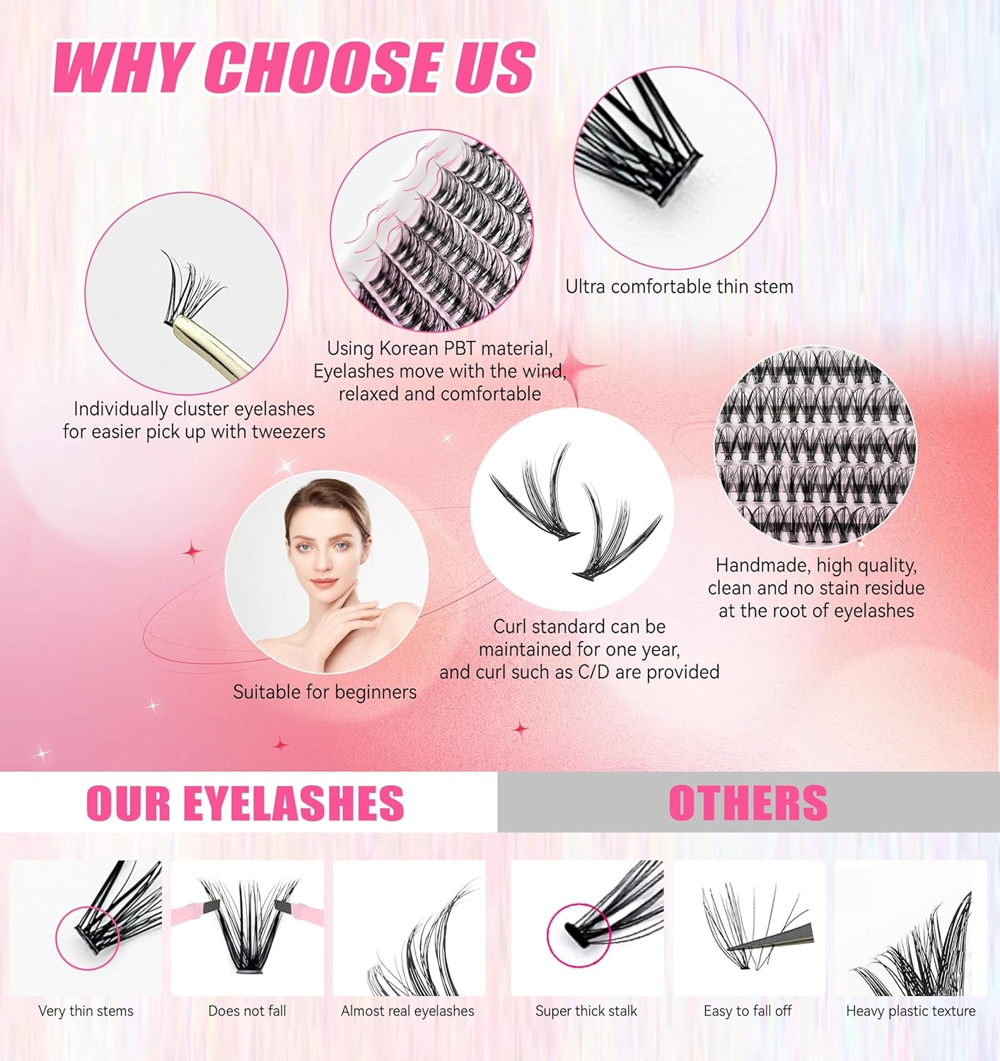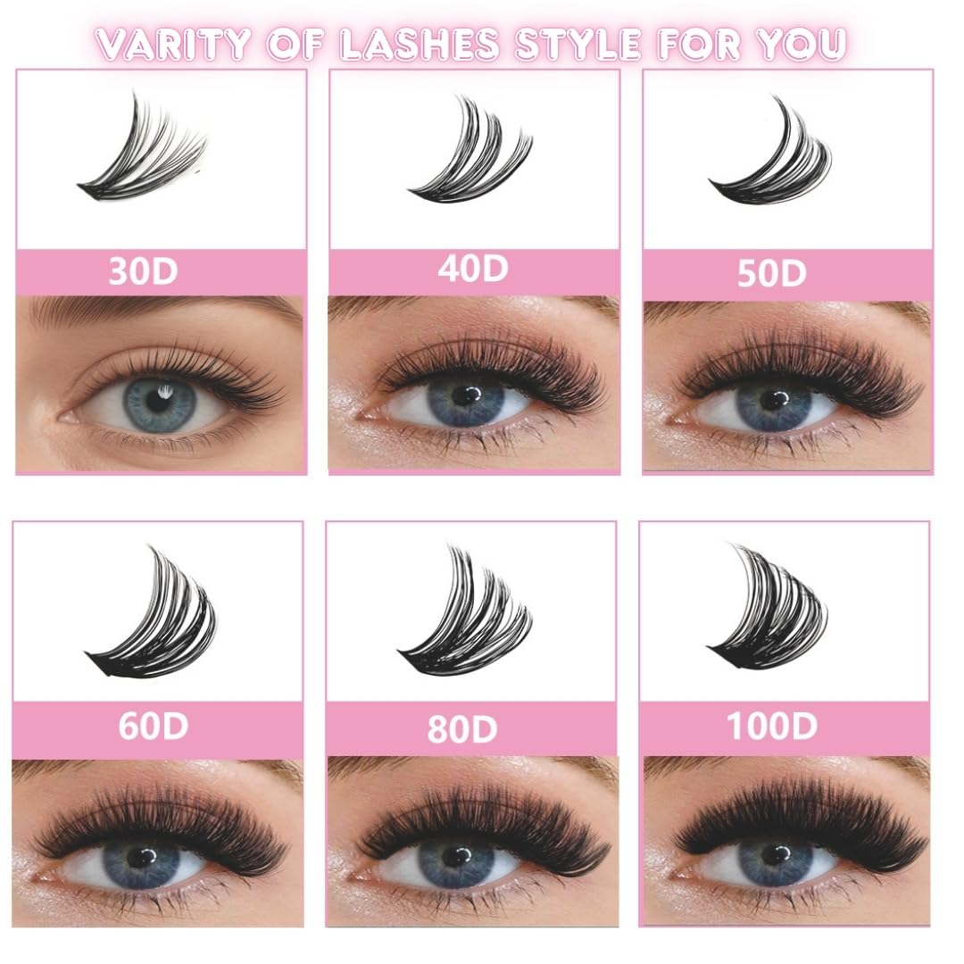 【280 Wispy Clusters in 60D & 80D Mix】 With 280 ultra-light 0.07mm lash clusters, our kit offers both natural and voluminous styles. Mix and match 60D and 80D clusters to customize your perfect lash look.