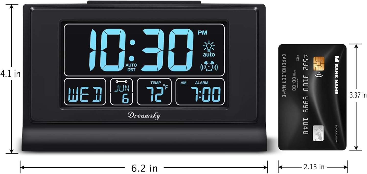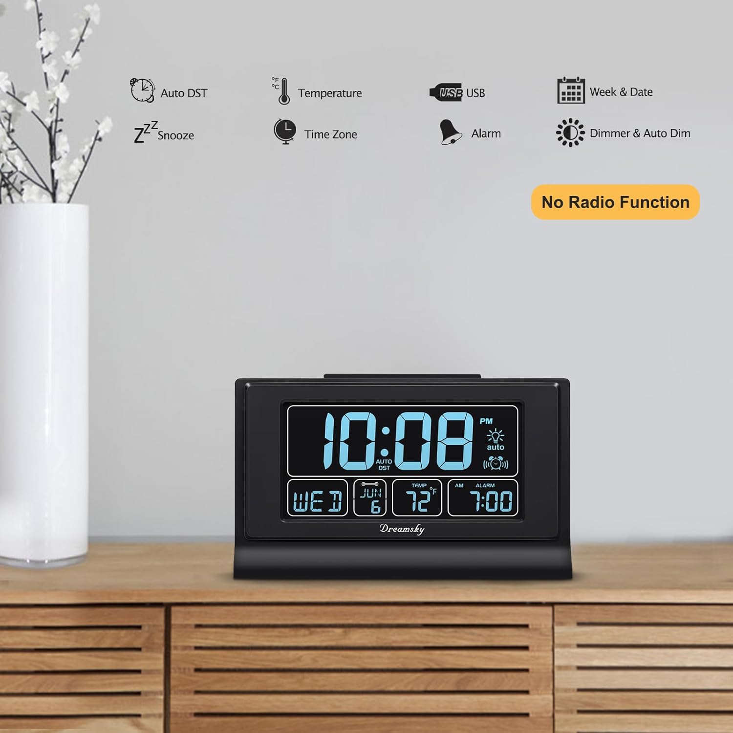 The simple auto set alarm clock comes with no setting hassles as the USA local time is downloaded to the digital clock and reserved with a button cell battery. Simply plug the bedroom clock into wall outlet, set your time zone (EST, NST, AST, HAT, AKT, PST, MST, CST) and you are there!