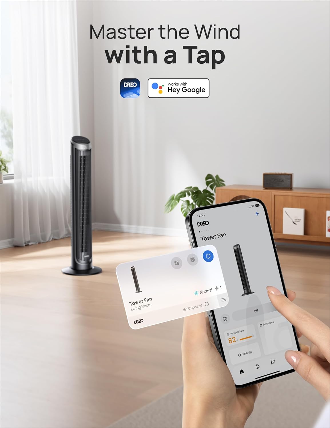 Enjoy Ultra-Fast Winds: Dreo’s aerodynamic airflow system of this smart tower fan delivers refreshing air up to 26ft/s, covering every inch of your living space