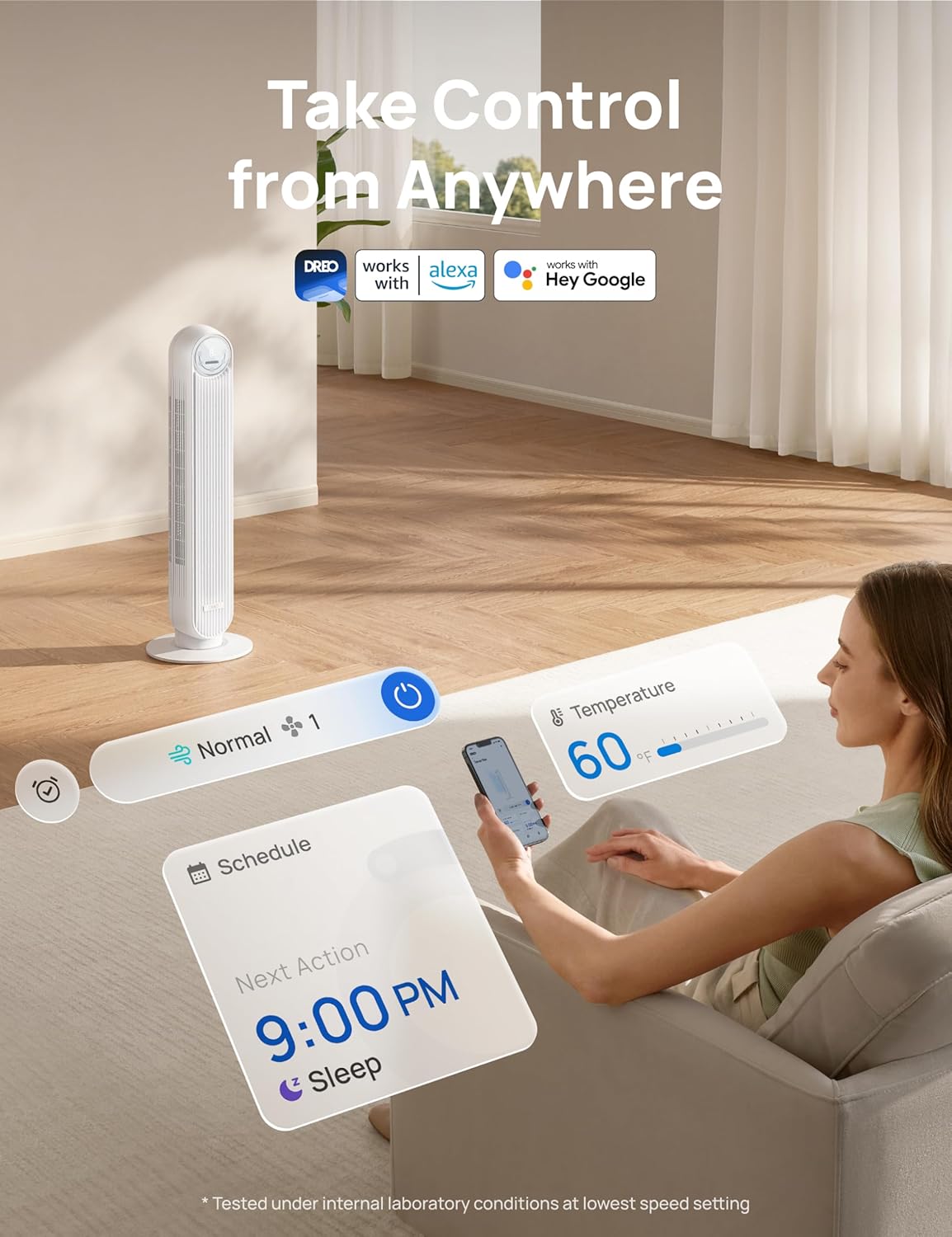 Seamless Smart Integration: Use your tower fan easily with voice or access more functions like air temperature, speed settings, and modes through the Dreo app. In Auto Mode,this floor fan senses the ambient temperature and automatically adjusts fan speeds.