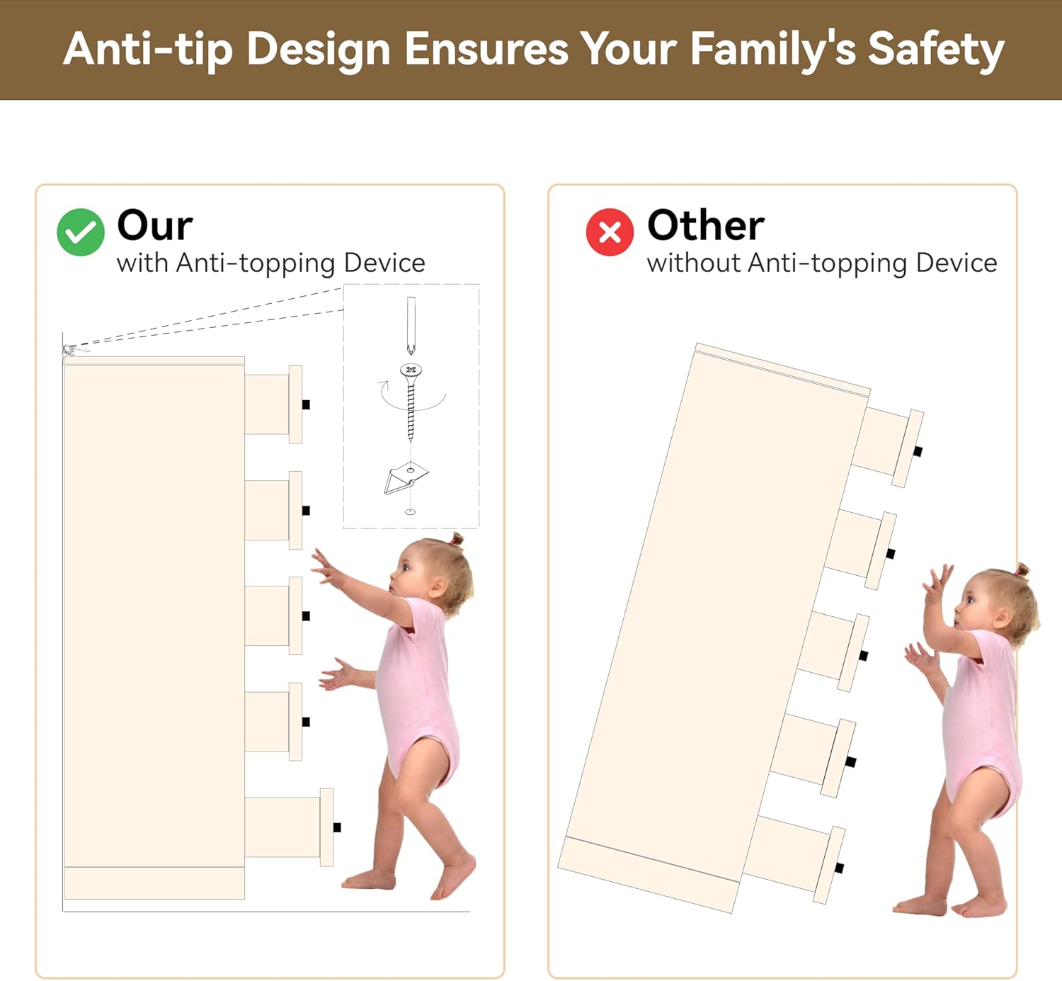 ✔【Wooden Dresser】The chest of drawers is made entirely of wood and is very strong and stable. Each wooden drawer can hold up to 50 pounds and the wooden table top can hold up to 250 pounds. The surface of the cabinet is water and stain resistant and easy to wipe down. We also offer an anti-tip kit for added stability and safety!