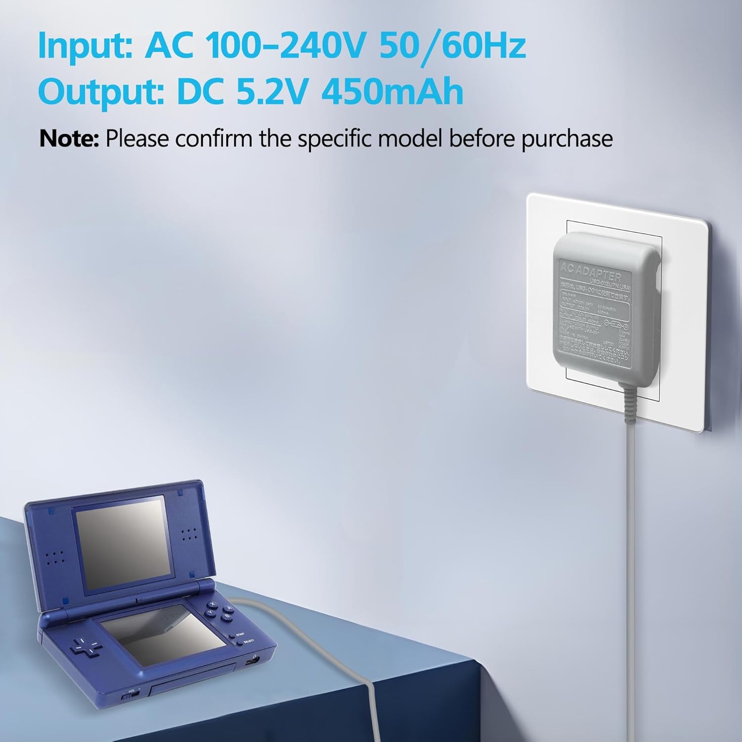 【DS Lite Power Cord】: Input: AC 100-240V 50/60Hz; Output: DC 5.2V 450mA; Cable Length: 3.8 feet / 115 cm. Works with 100-240V AC input (50/60Hz): Use it at home, on international trips, or during business travel. One charger covers all your locations – no need for voltage converters