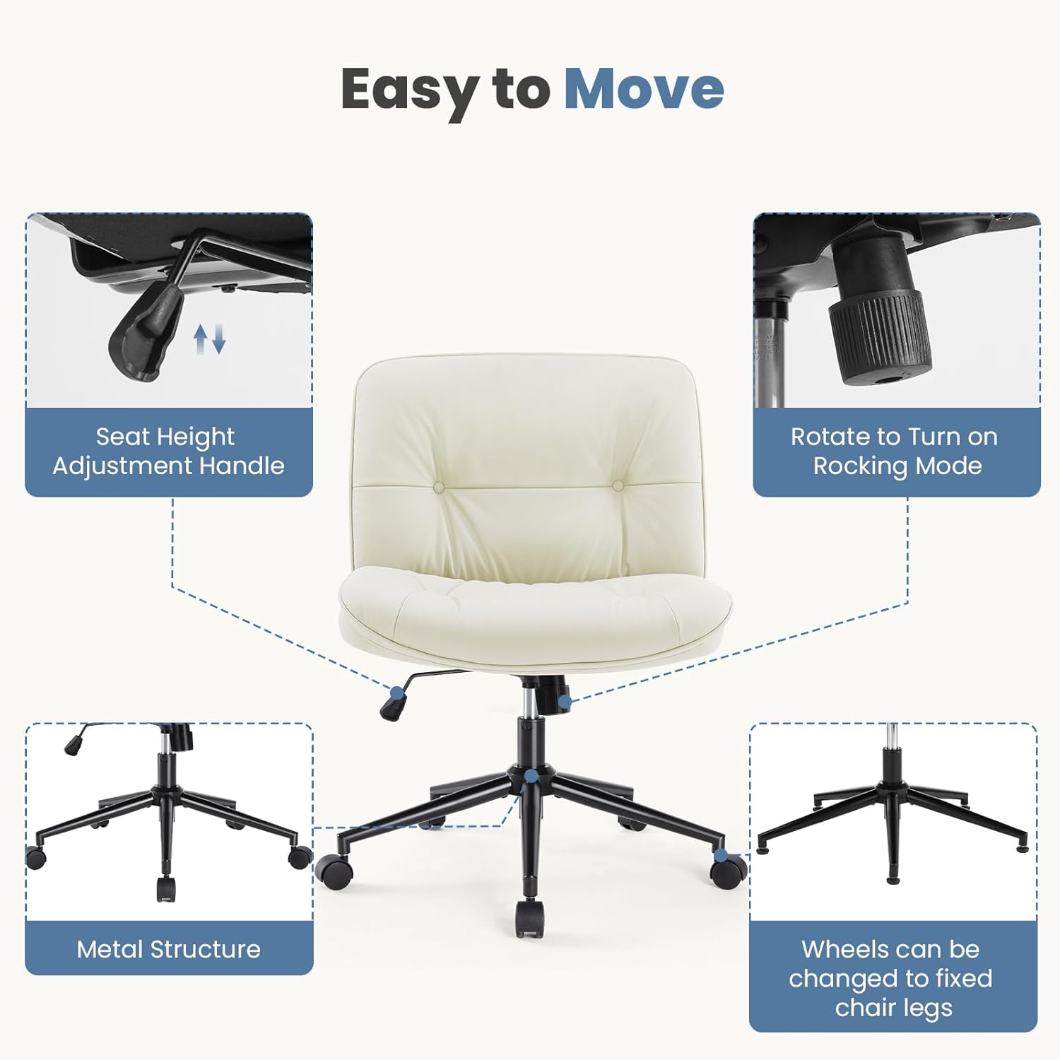 【Heavy Duty & Stable Construction】Built to last, this chair features a robust metal frame that supports up to 300lbs. The criss-cross leg design ensures maximum stability and a solid foundation. With its balanced center of gravity, the chair is stable and not prone to tipping. Whether you’re rolling across the room or sitting still, this chair offers unwavering durability.