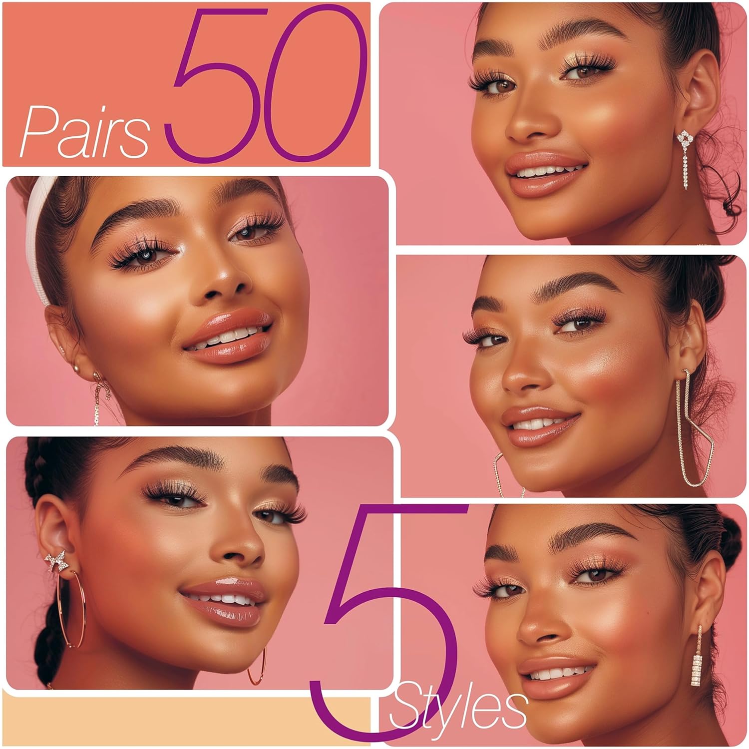 Eliace Eyelashes, (50 Pairs,5 Styles) Luxurious Faux Mink Lashes Natural Look Wispy Fluffy Handmade Cat Eye False Lash Pack, False Eyelashes Set, Fake Lashes Strips, Makeup Fake Eyelashes Pack