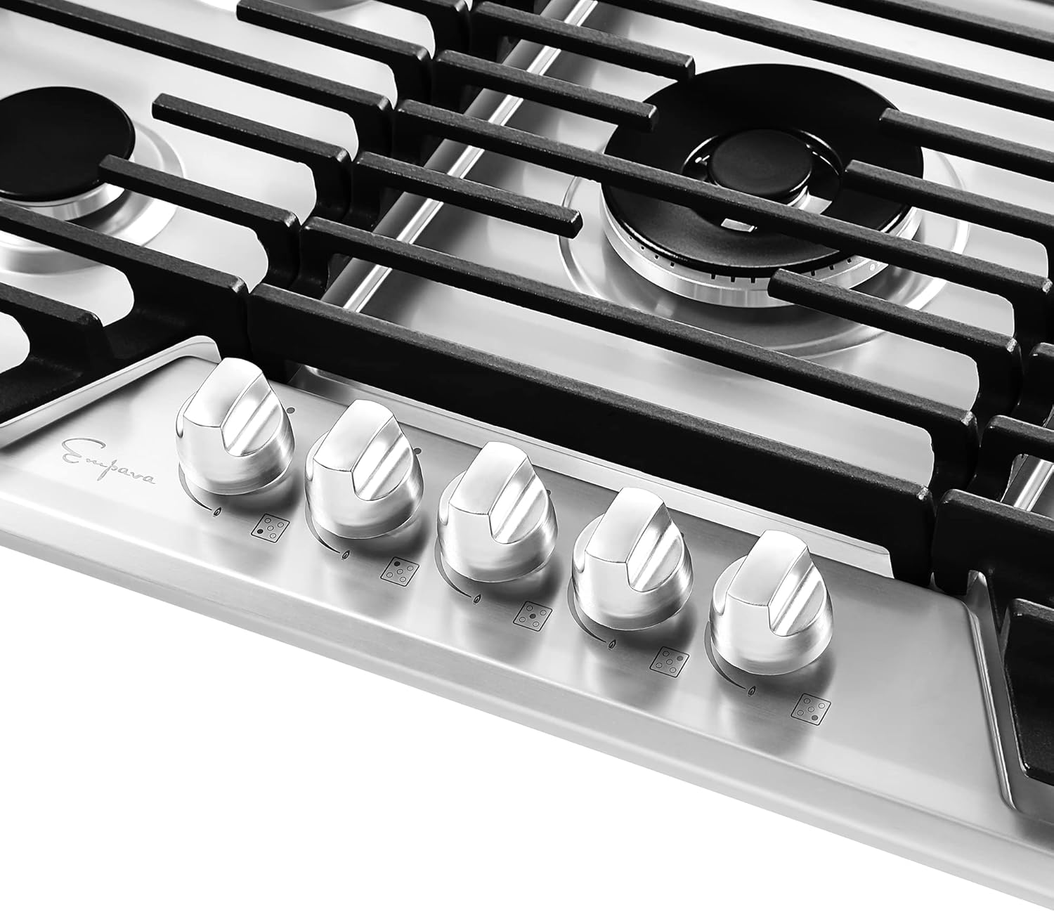 Versatile Burners for Precision Cooking: Empava’s recessed gas cooktop is equipped with four distinct burner sizes: an 18,000-BTU triple ring burner, two 12,000-BTU rapid burners, a 9,500-BTU semi-rapid burner, and a 6,000-BTU auxiliary burner. These burners provide uniform heat distribution, allowing you to simmer, boil, stir-fry, steam, melt, or caramelize with accuracy and ease.