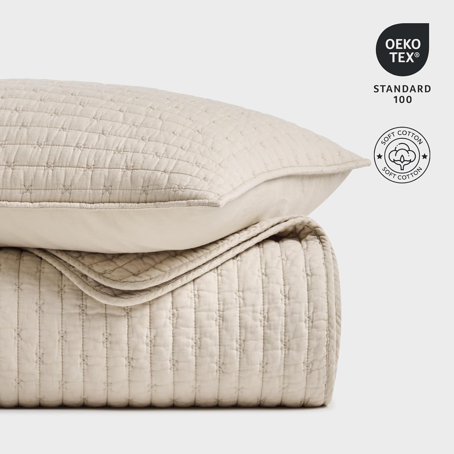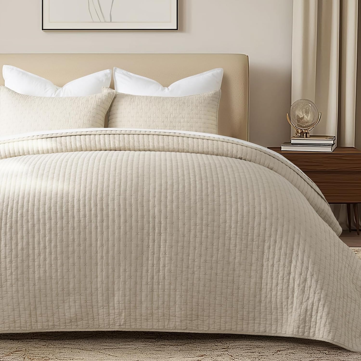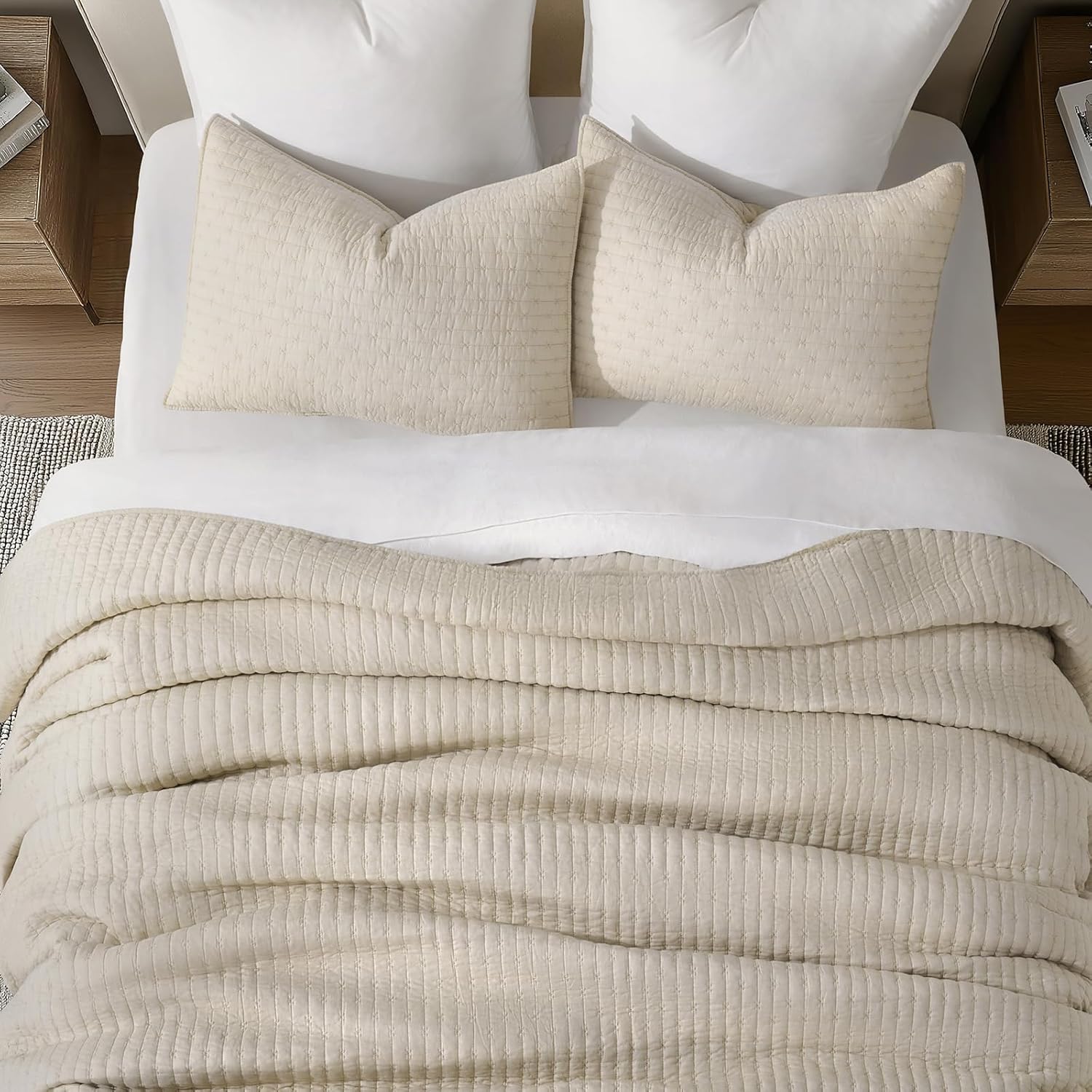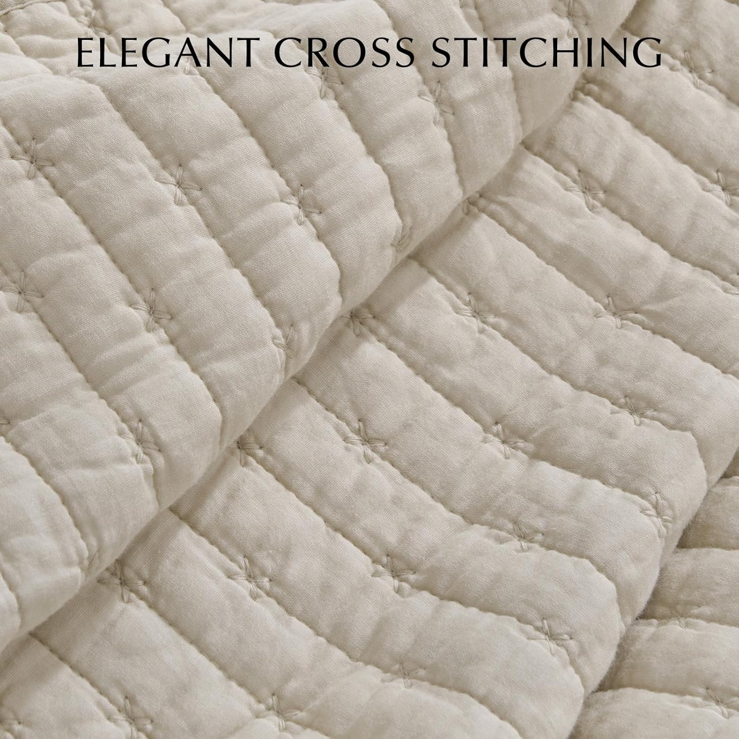 EVERGRACE Cross Stitch Pre-Washed Cotton Quilt Bedding Set King Size, Oversized 3 Pieces Lightweight Bedspread Coverlet for All Season, with 2 Matching Shams, Flax Beige,108″x96″