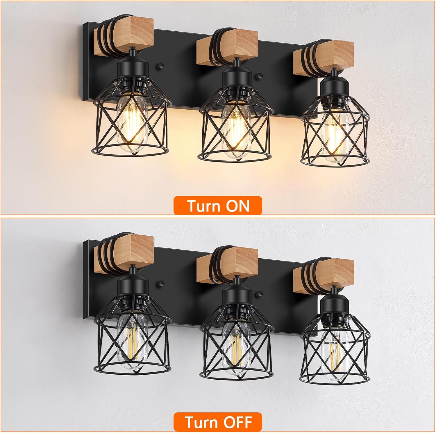 【Farmhouse Bathroom Light Fixtures】Rustic wood and black metal cage brings more farmhouse style to your life, the light passes through the industrial matte black cage and has an antique rustic appearance. The reflected light and shadow effect adds more fun to your bathroom.
