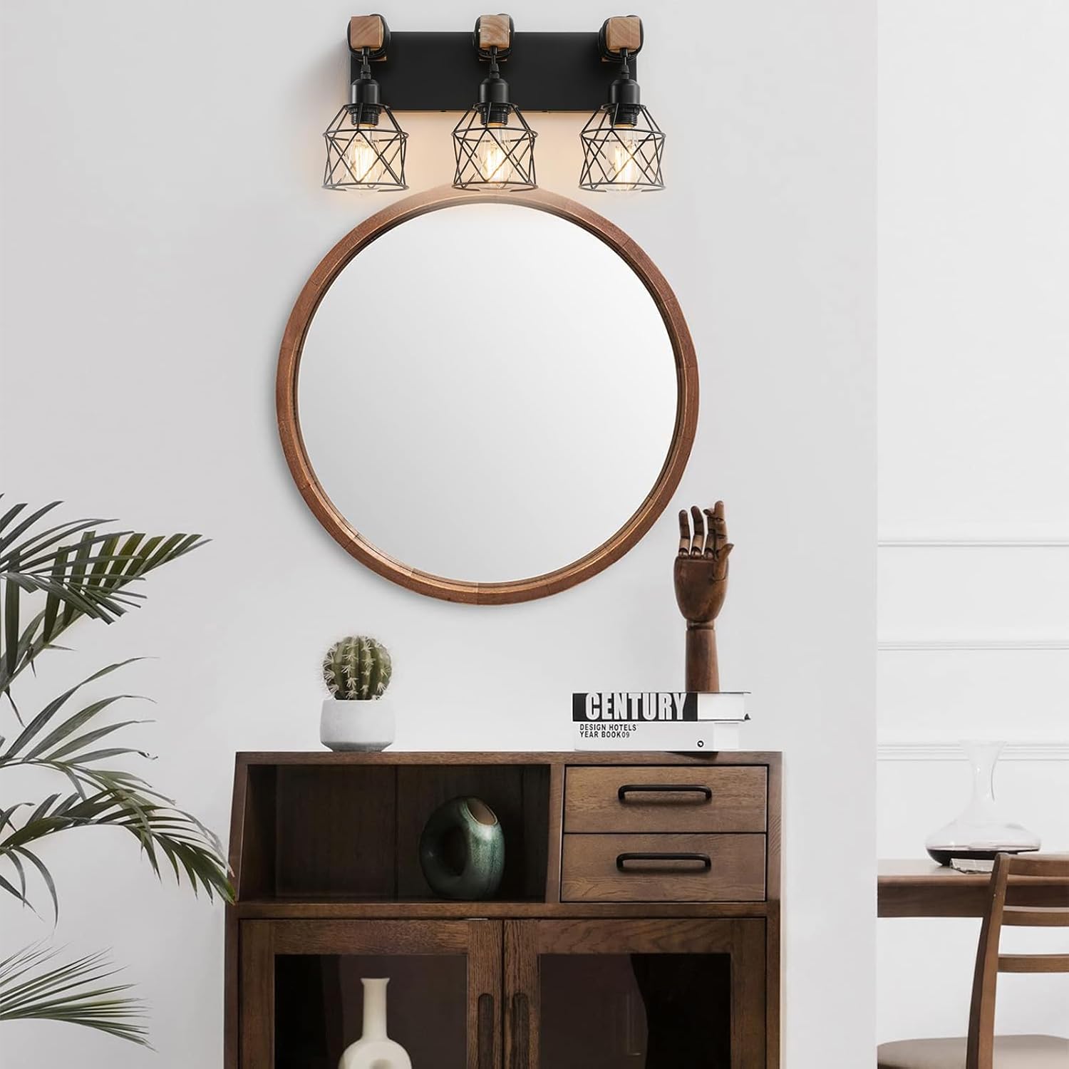 【Farmhouse Vanity Light】High-quality solid wood and black metal cage bring a classic farmhouse style decoration. The brand-new appearance design takes into account the modern farmhouse style and individuality. The cage-shaped metal lampshade with 360° light transmission is also an excellent choice for the main lighting of the bathroom.