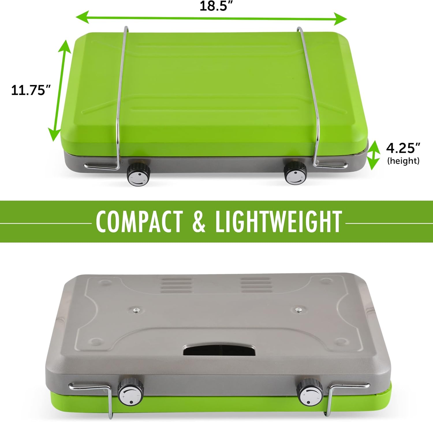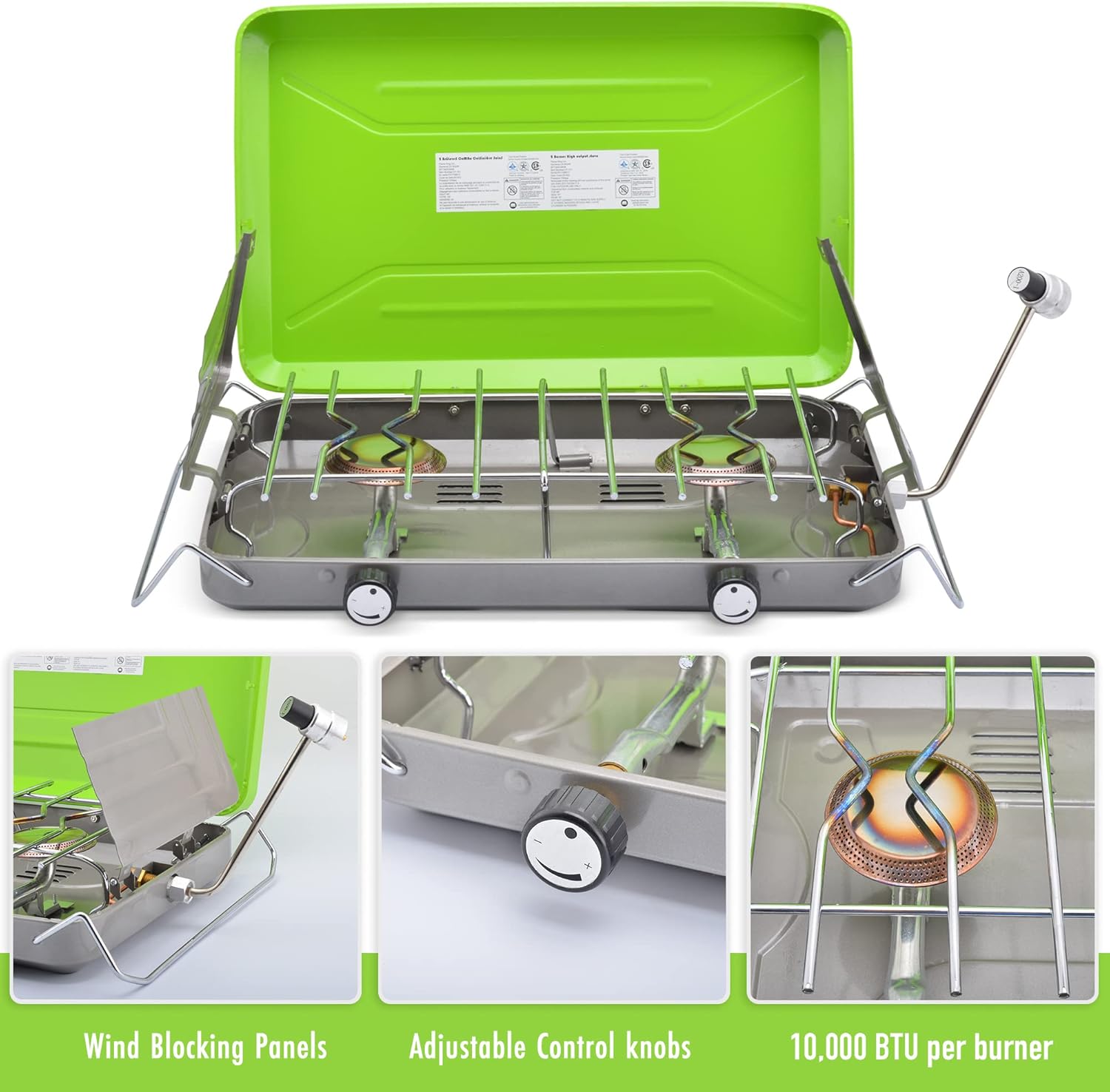 20,000 BTU HEAT OUTPUT: From the 2 burners, enough to cook food for the entire family and friends! Each burner has an adjustable control knob for precise heat control.