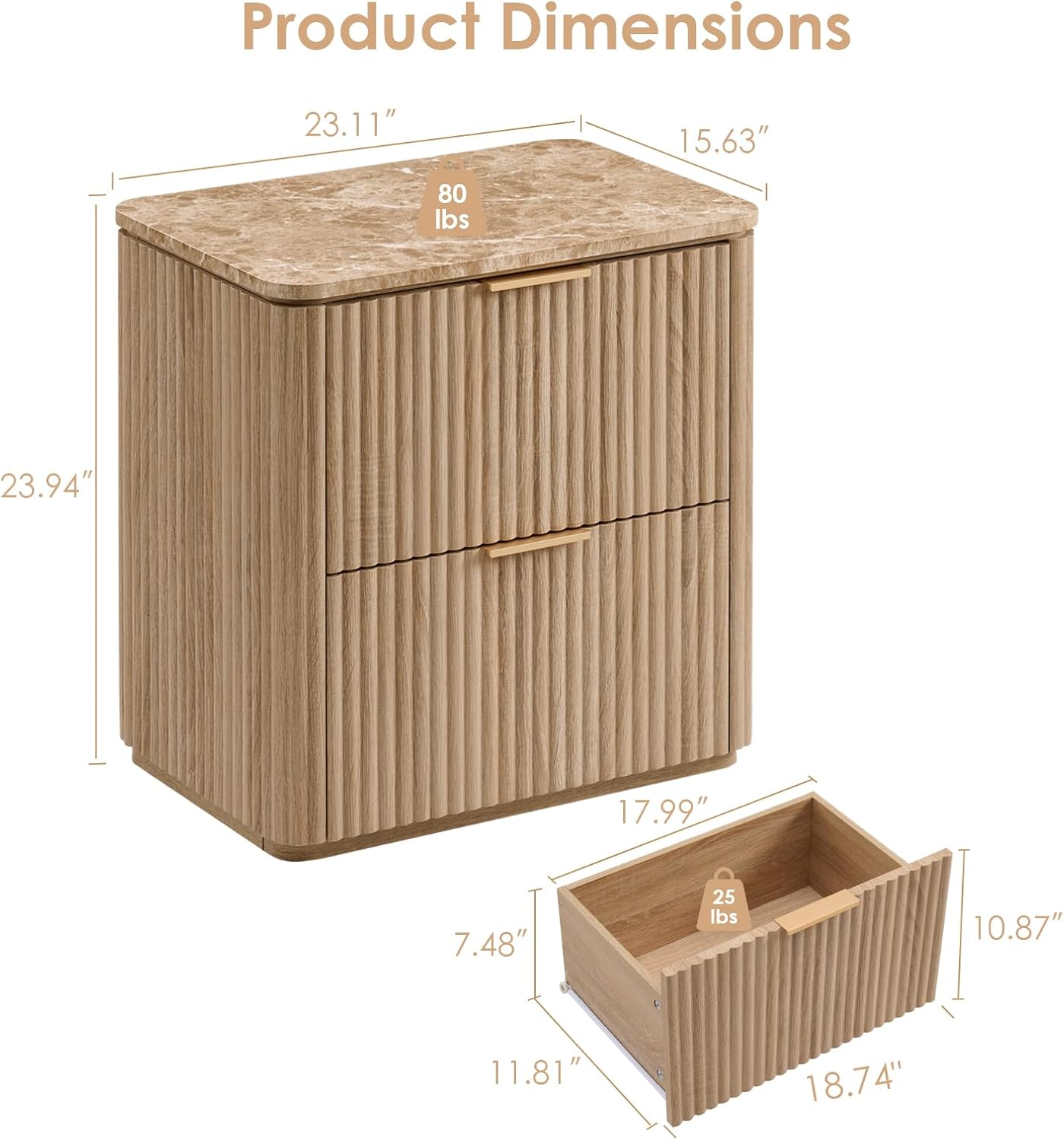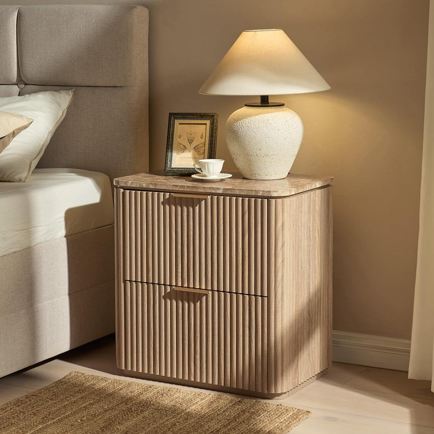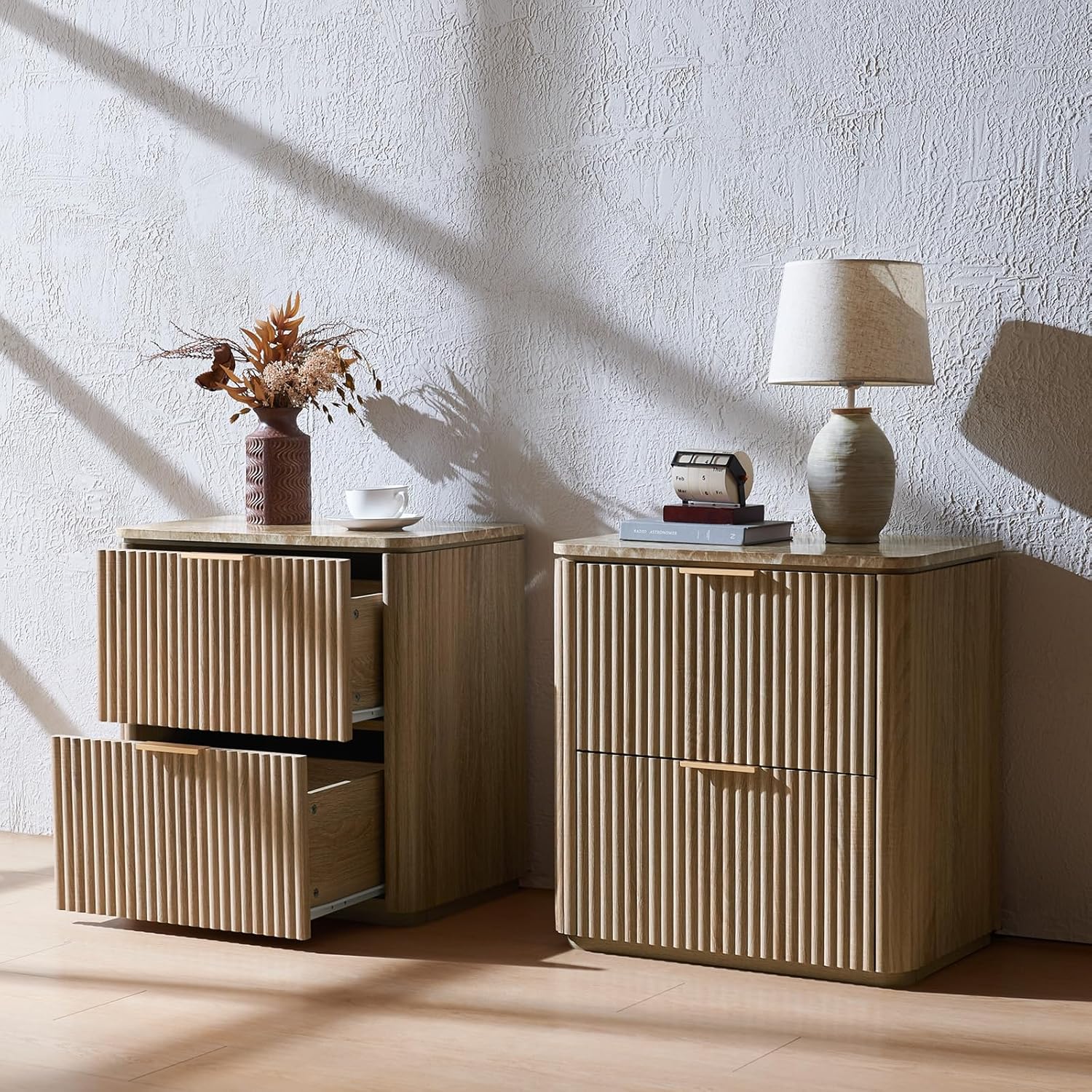Fluted Nightstand Set of 2, Bedside Table with 2 Drawers, Engineered Wood End Table with Faux Marble-Top, Curved Corners, Metal Handle, Modern Night Stand for Bedroom, Small Spaces, Natural Oak